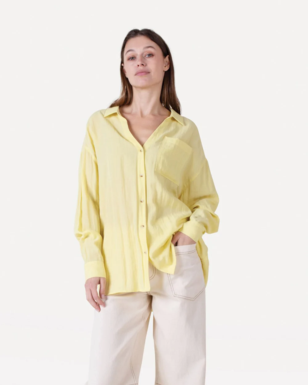 The Boisy Shirt in Lemon Grass is light, breezy, and just the right amount of undone. Designed with a loose fit, V-neckline, and adjustable tie at the hem, it’s made to move with you. The lightly structured fabric keeps it fresh and easy. Style tip: Pair with relaxed denim or shorts for a soft, sun-ready look.
