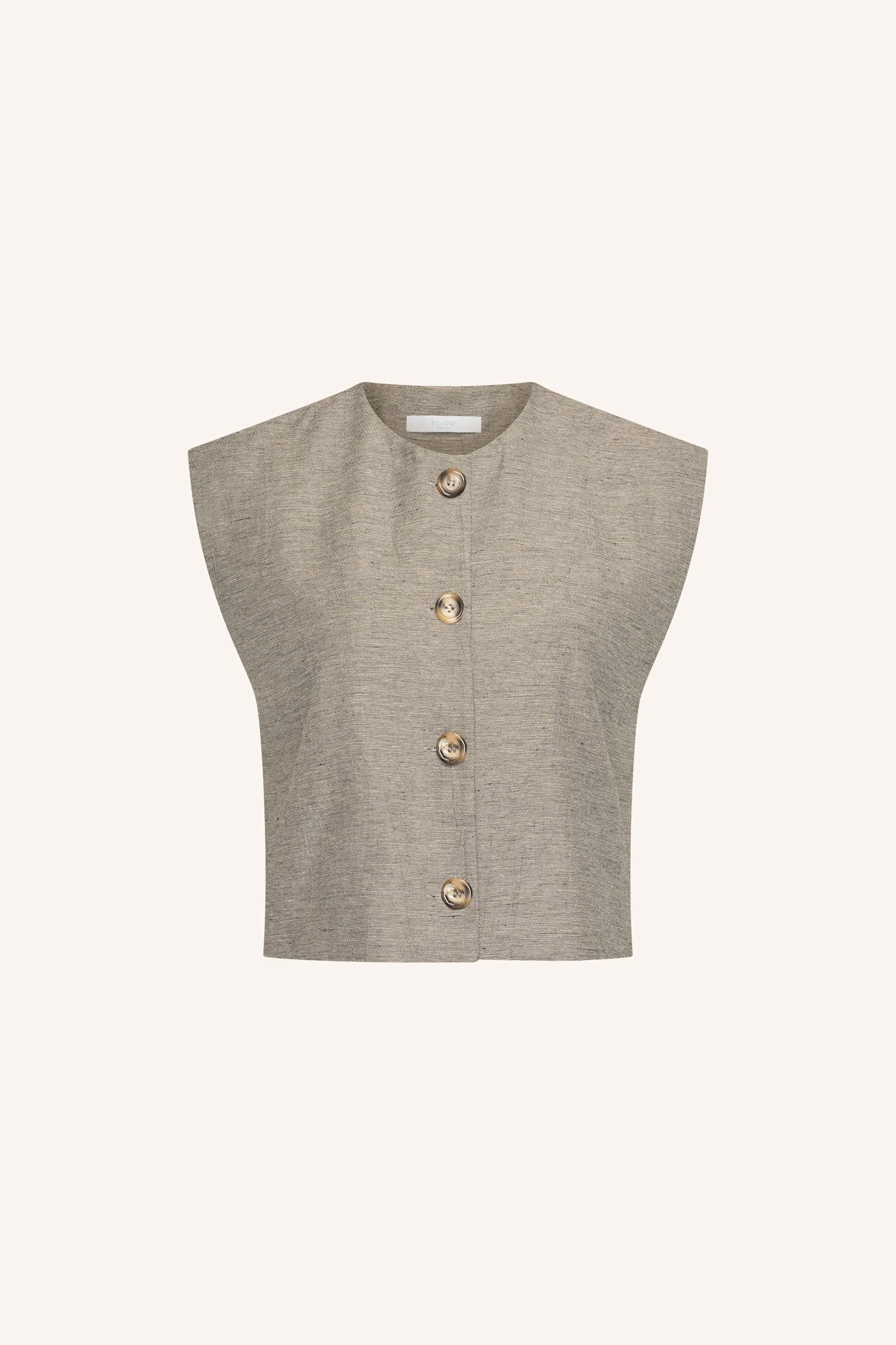 Ontdek het nori melange gilet, een stijlvolle toevoeging aan je casual chic garderobe. Met een comfortabele normale pasvorm en een ronde halslijn biedt dit mouwloze gilet een elegante uitstraling. De knoopsluiting maakt het makkelijk om te dragen en te combineren, perfect voor een veelzijdige look die je moeiteloos van dag naar avond brengt.