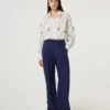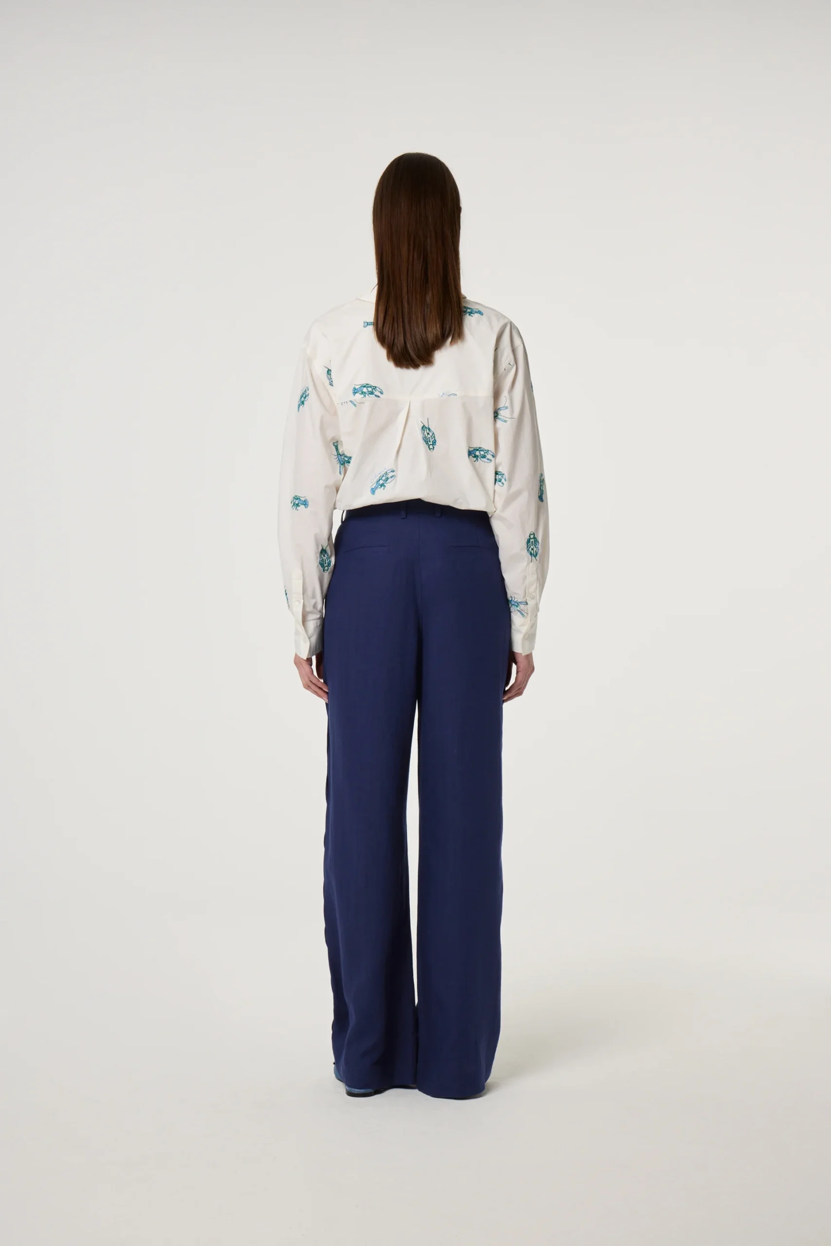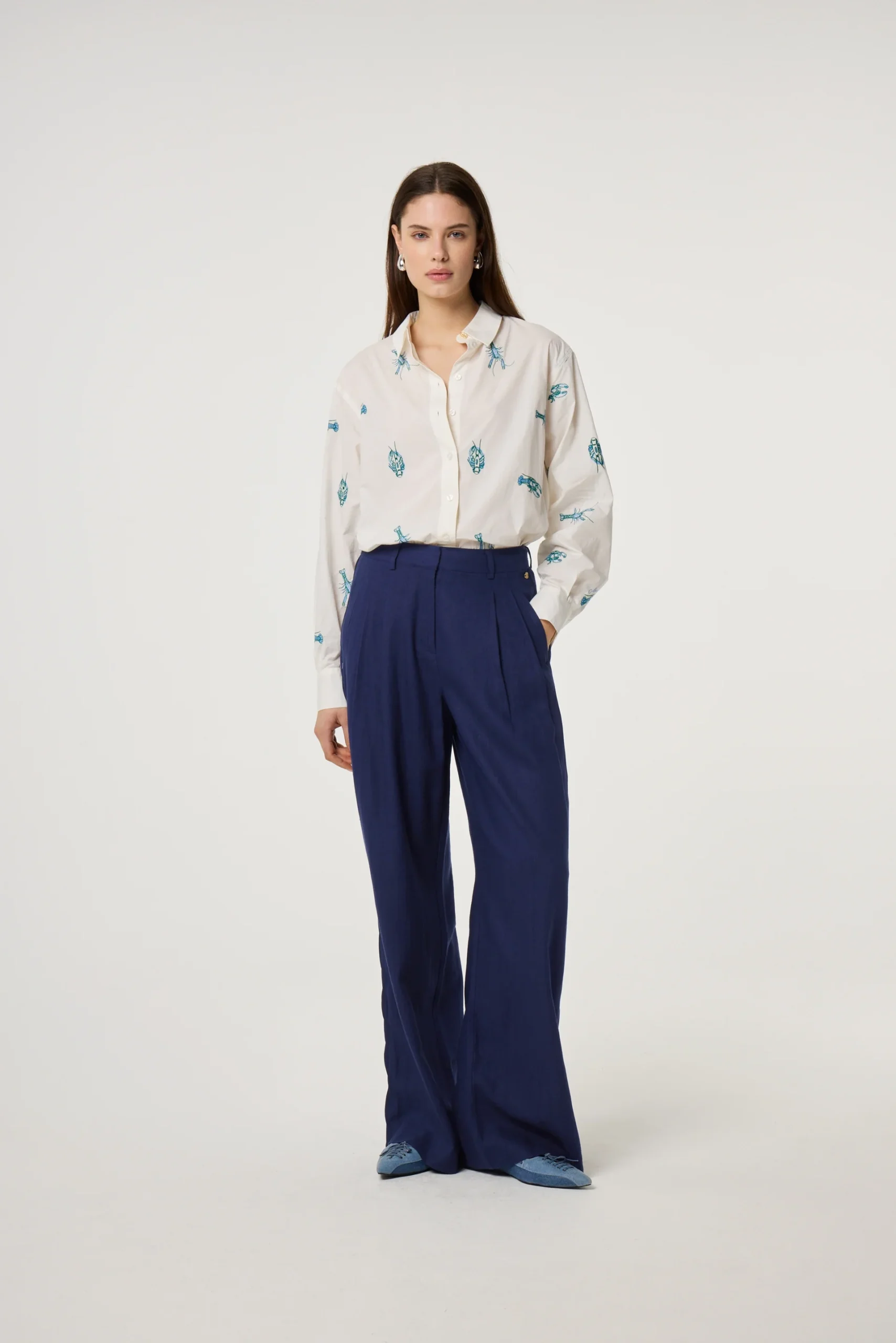 This white long-sleeve blouse features an all-over blue langoustine print for a fun, unexpected twist. Designed in a loose fit with a single pocket on the left side, it feels relaxed and easy to wear. Slightly see-through for a light and airy feel, it’s made from 100% organic cotton, making it perfect for everyday styling with a bit of personality.