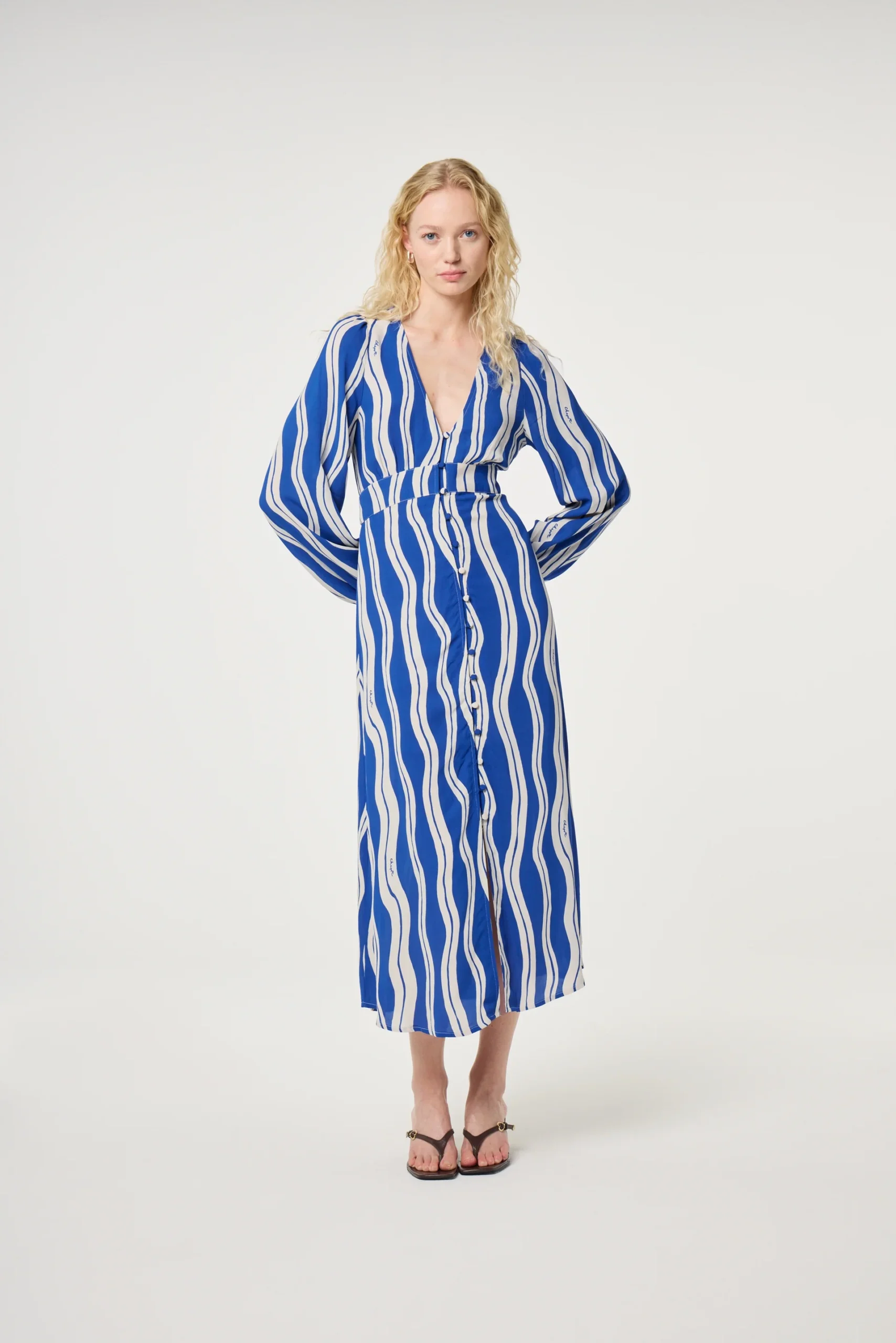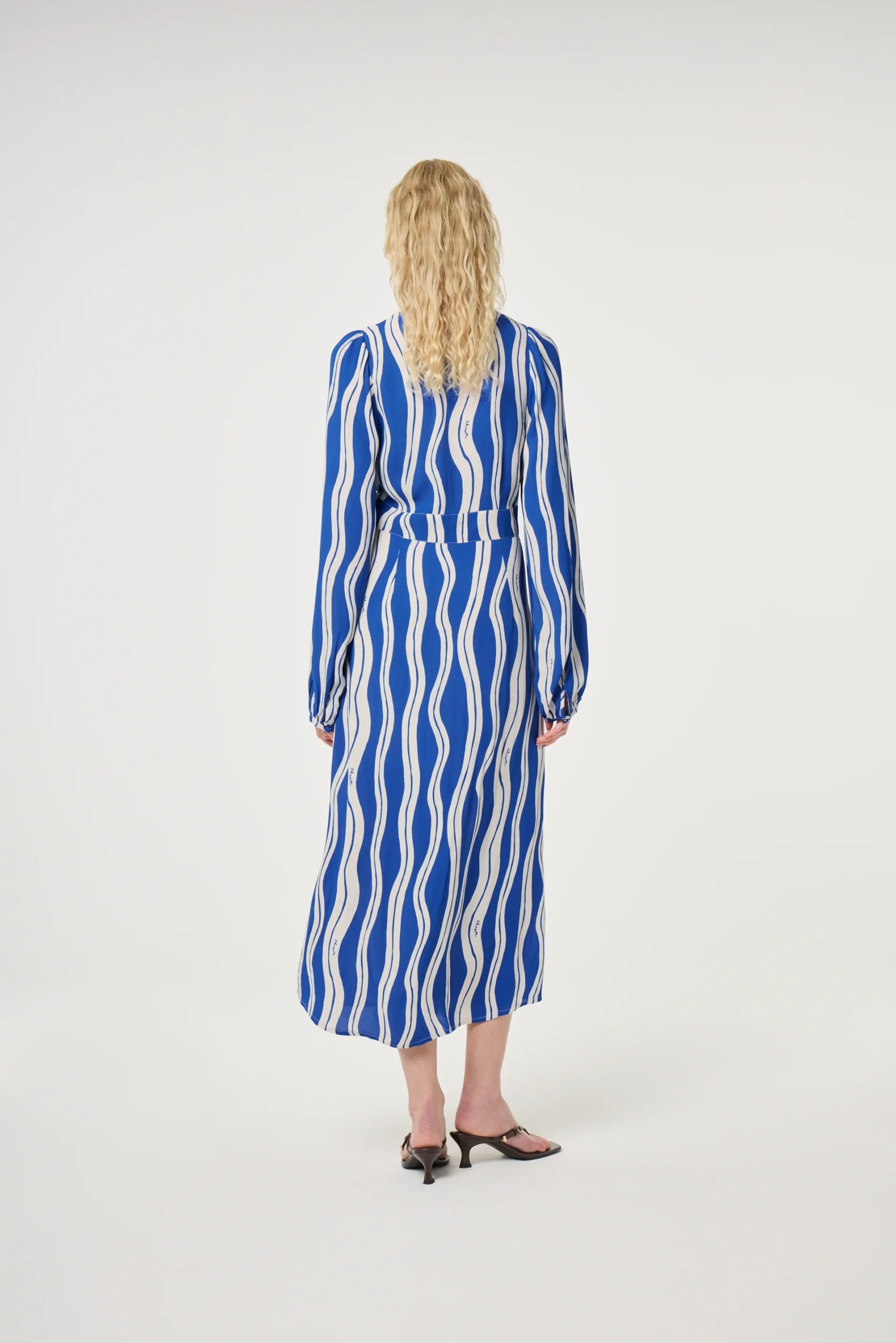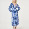This long-sleeve dress features a breezy blue striped pattern with a relaxed silhouette. Lightweight and comfortable, it offers effortless style and ease for everyday wear or travel-ready looks.