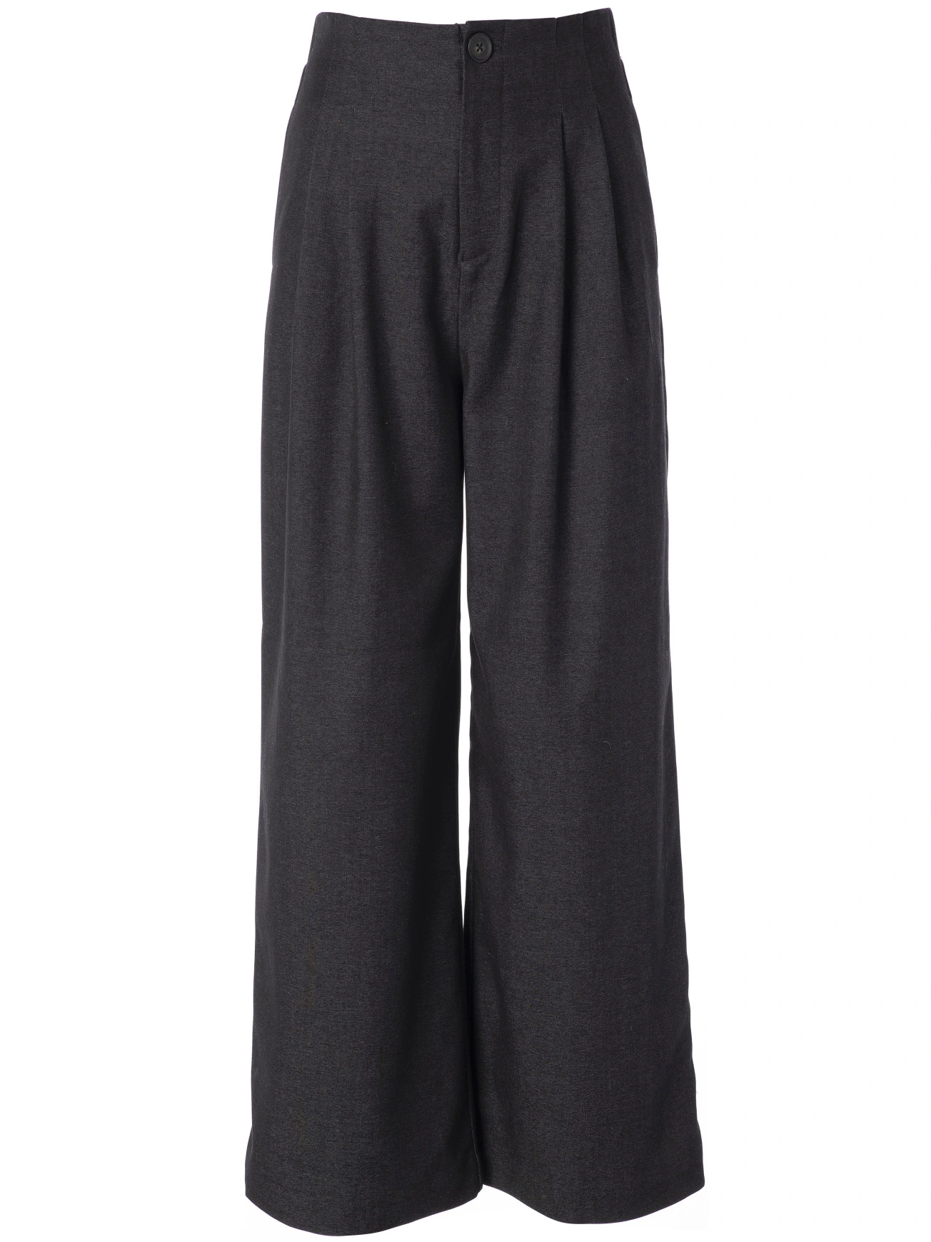 Een klassieke pantalon met een moderne twist. Deze diep donkerbruine broek heeft een hoge taille en wijde, soepelvallende pijpen voor een elegante, flatterende look. De zachte stof zorgt voor een comfortabele pasvorm, ideaal voor zowel kantoor als casual days.