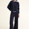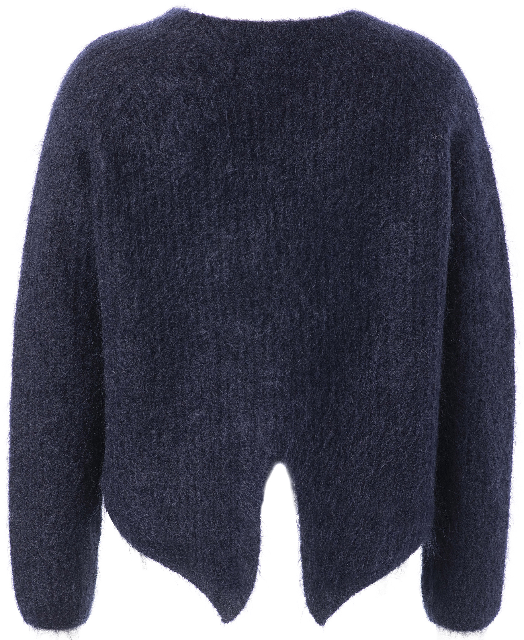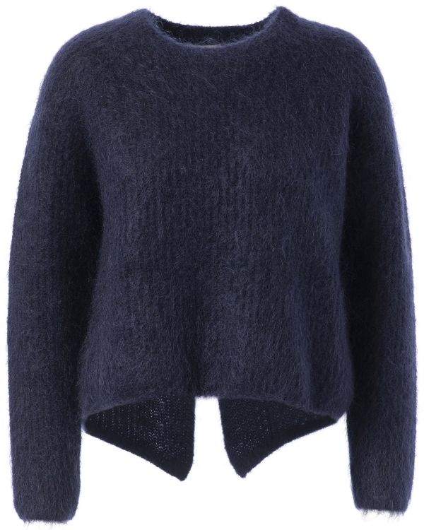 Een luchtig en zacht vest met een elegante twist. Dit navyblauwe model is gemaakt van een mohairmix en heeft een subtiel glanzende, harige structuur. De unieke vorm aan de achterzijde geeft het vest een moderne, vrouwelijke uitstraling. Draag het over een blouse of jurk voor een cozy maar stijlvolle look.