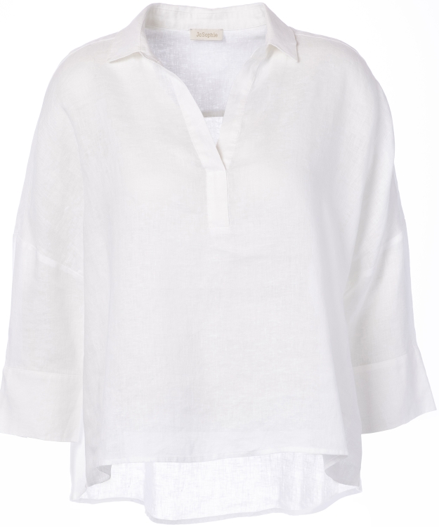 Deze witte blouse is een echte zomerklassieker. Gemaakt van een luchtige linnenblend en perfect voor warme dagen. De V-hals met open kraag geeft de blouse een ontspannen, maar elegante uitstraling.
