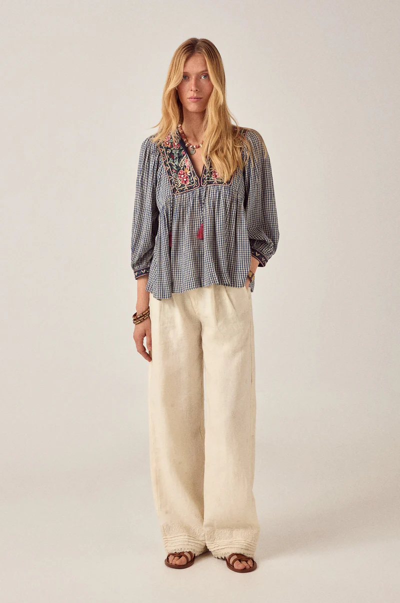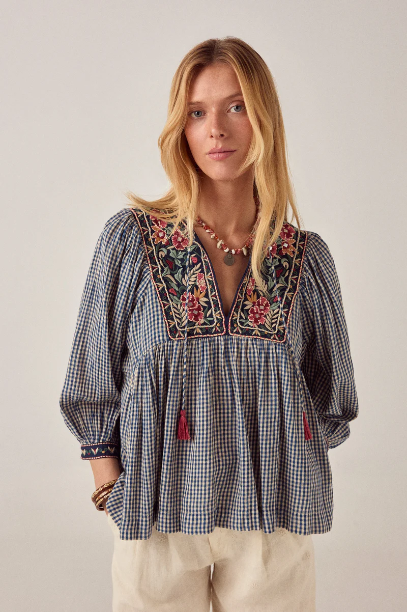 Long-sleeve blouse in lightweight cotton voile. Collared, button-down front, button cuffs. Soft, fluid hand that moves naturally with the body. Breathable and calm.