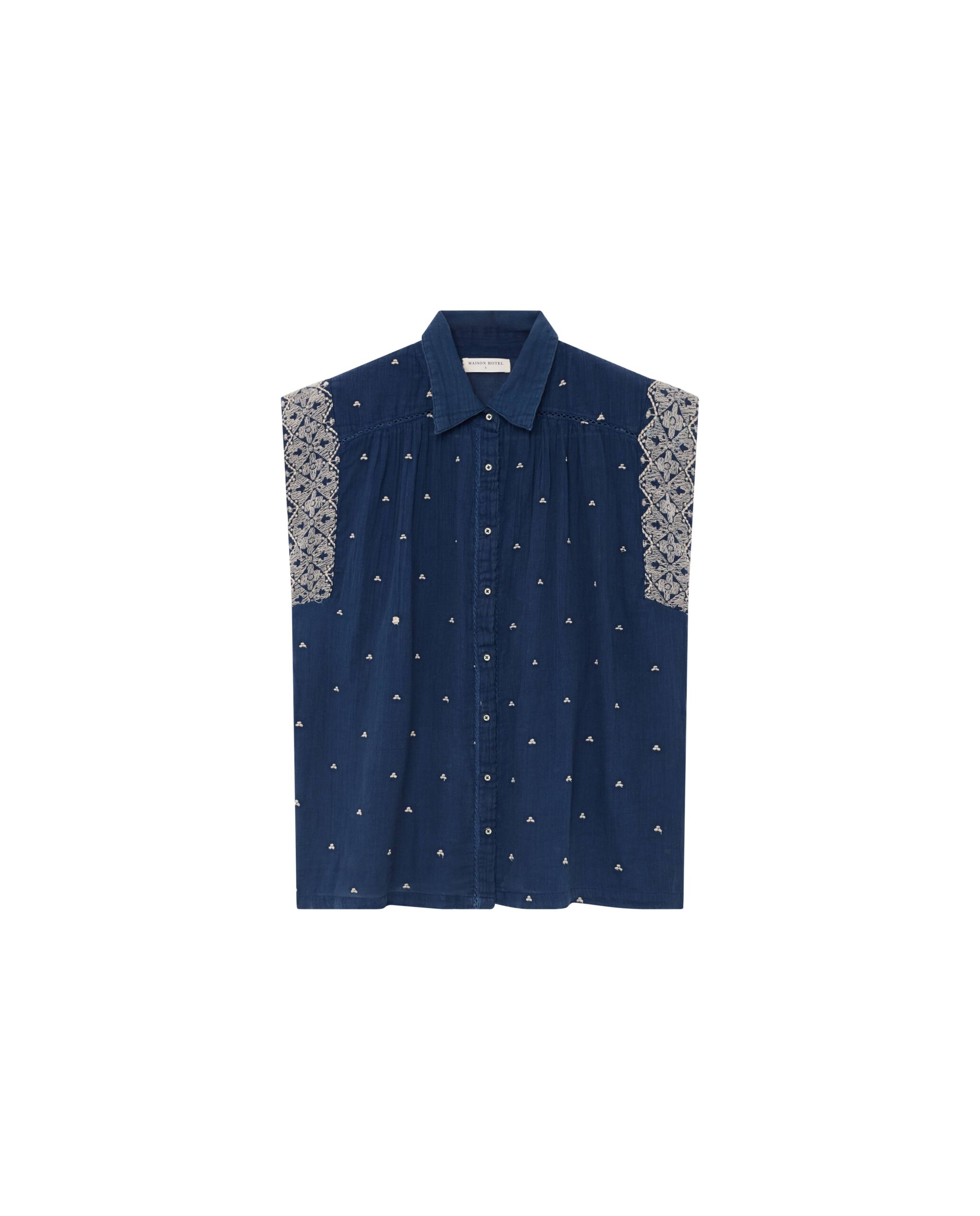 Sleeveless blouse in cotton. Collared neckline, [button-down or pullover?]. Sharp, uncomplicated line. Lace panels at the shoulders. Sits close to the body without being tight.