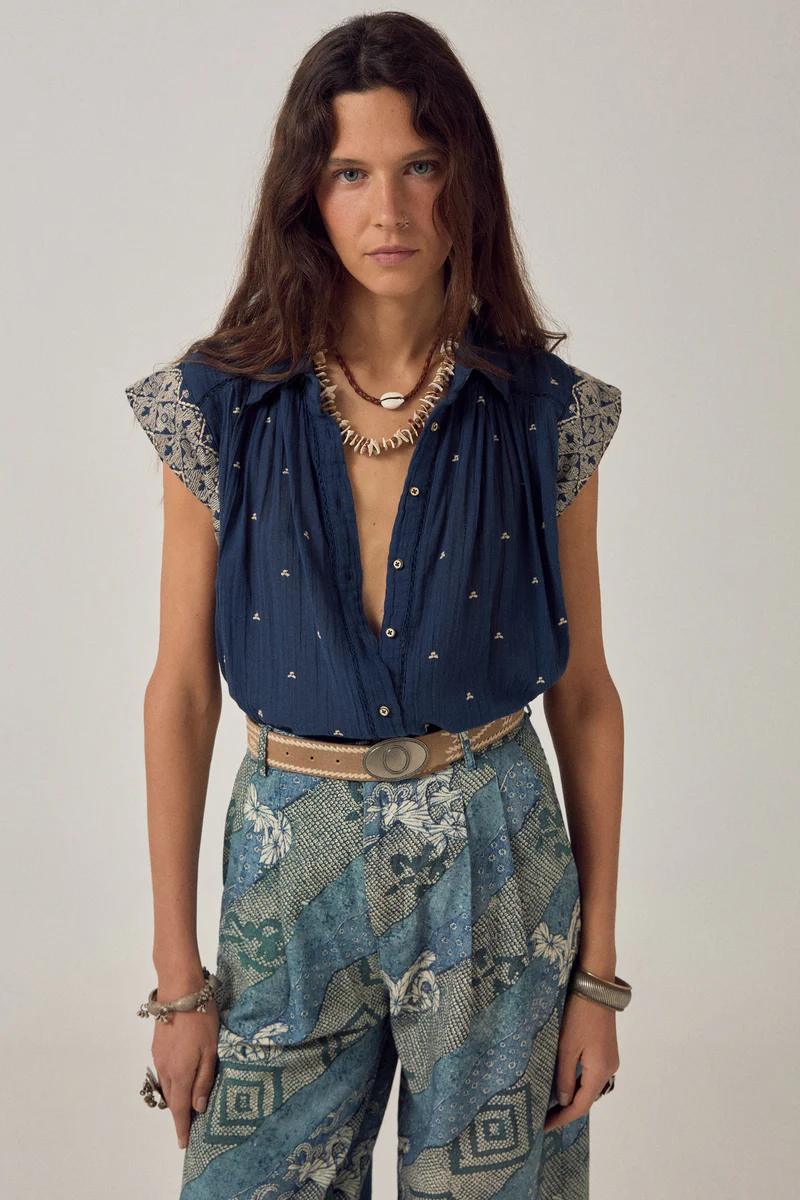 Deep, almost inky blue base—heavy in color but light in feel. Tiny white embroidered marks scattered across the surface, irregular and spaced like traces rather than pattern. They break the depth of the blue without softening it. Lace panels at the shoulders add texture and tension, not decoration.