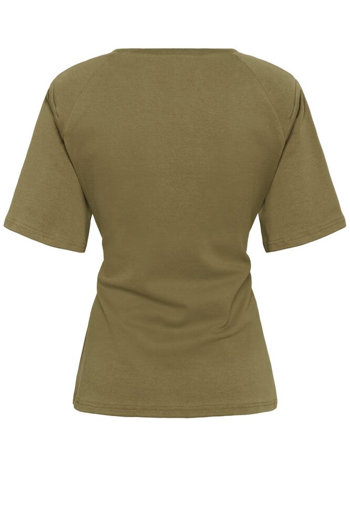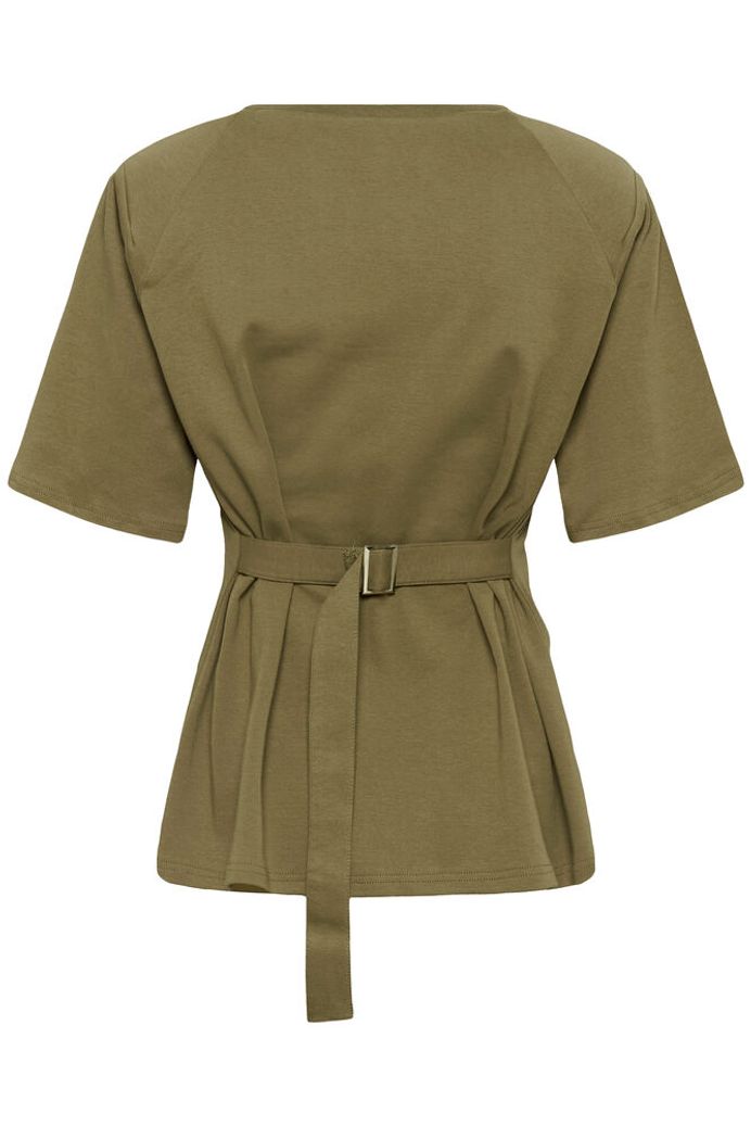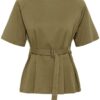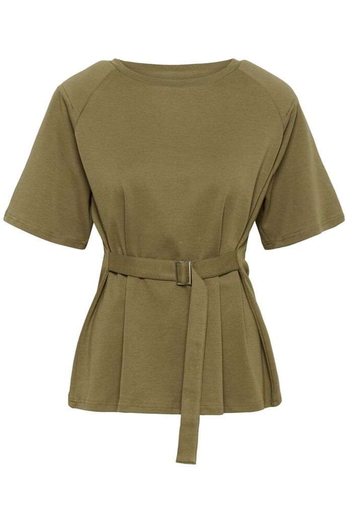 T-shirt met korte mouwen, ceintuur en rechte boxy pasvorm. De ronde hals en afneembare ceintuur met vierkante gesp zorgen voor een strakke stijl.