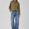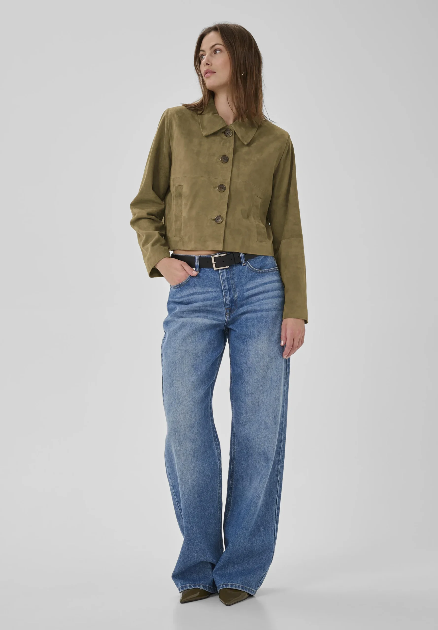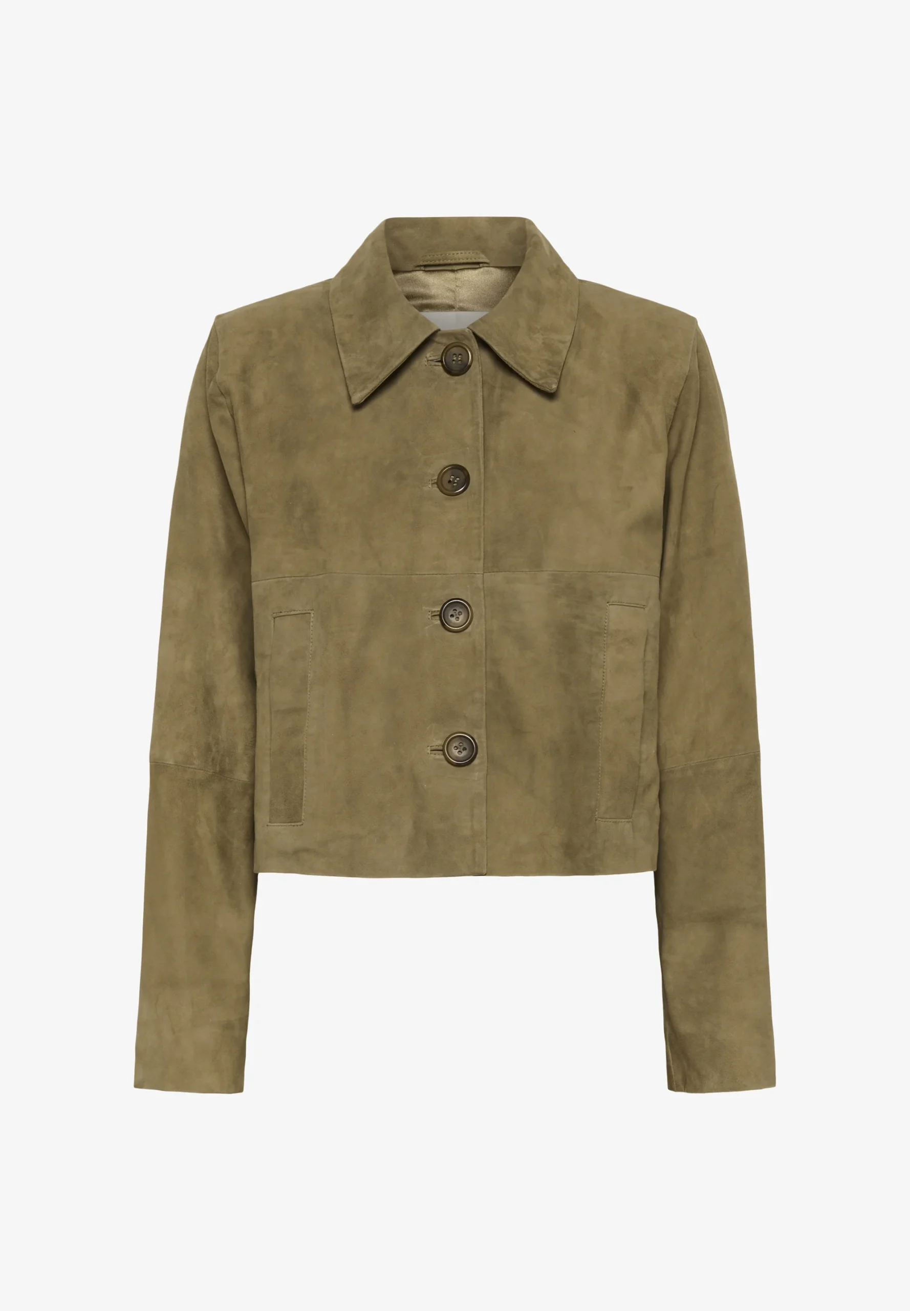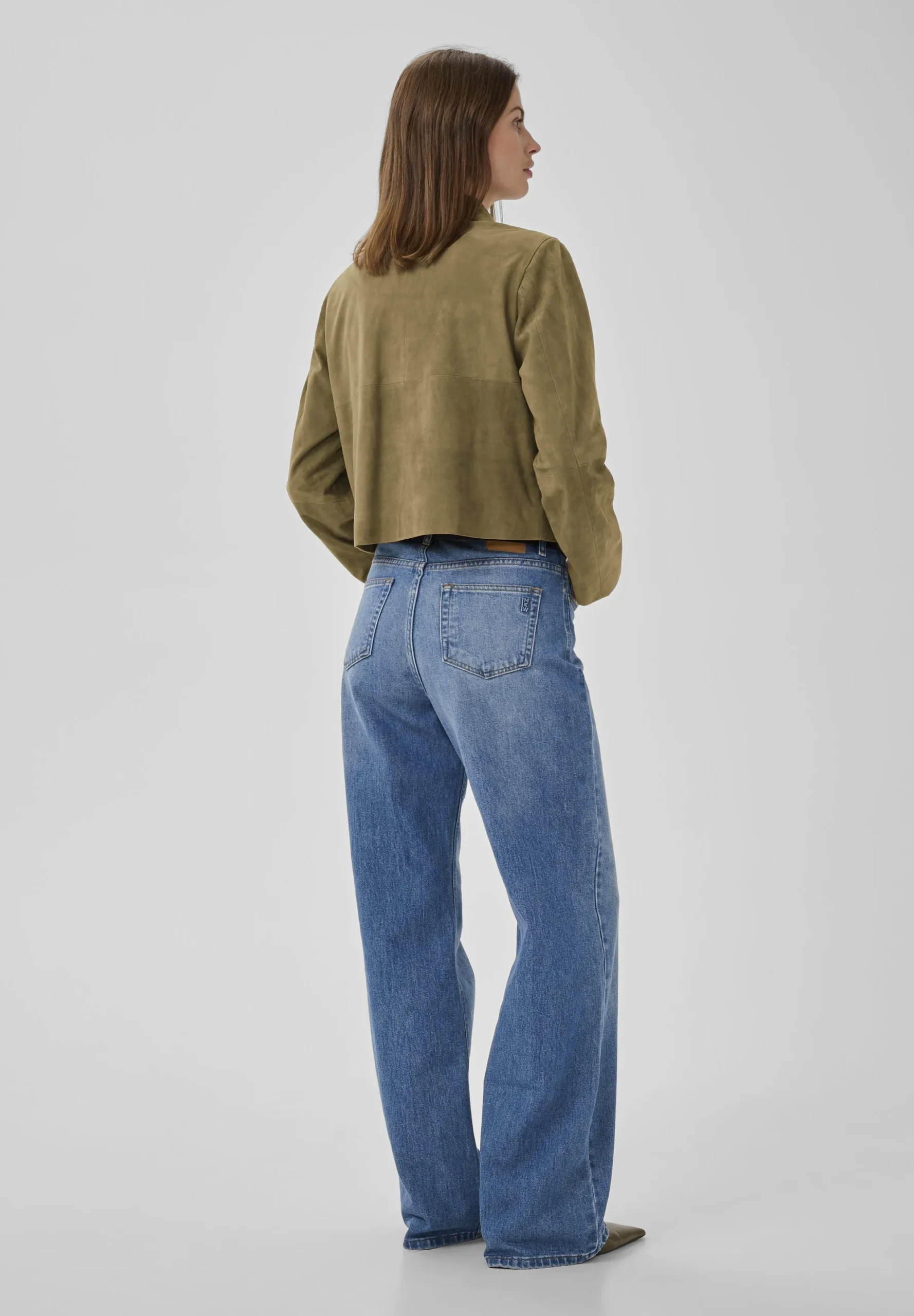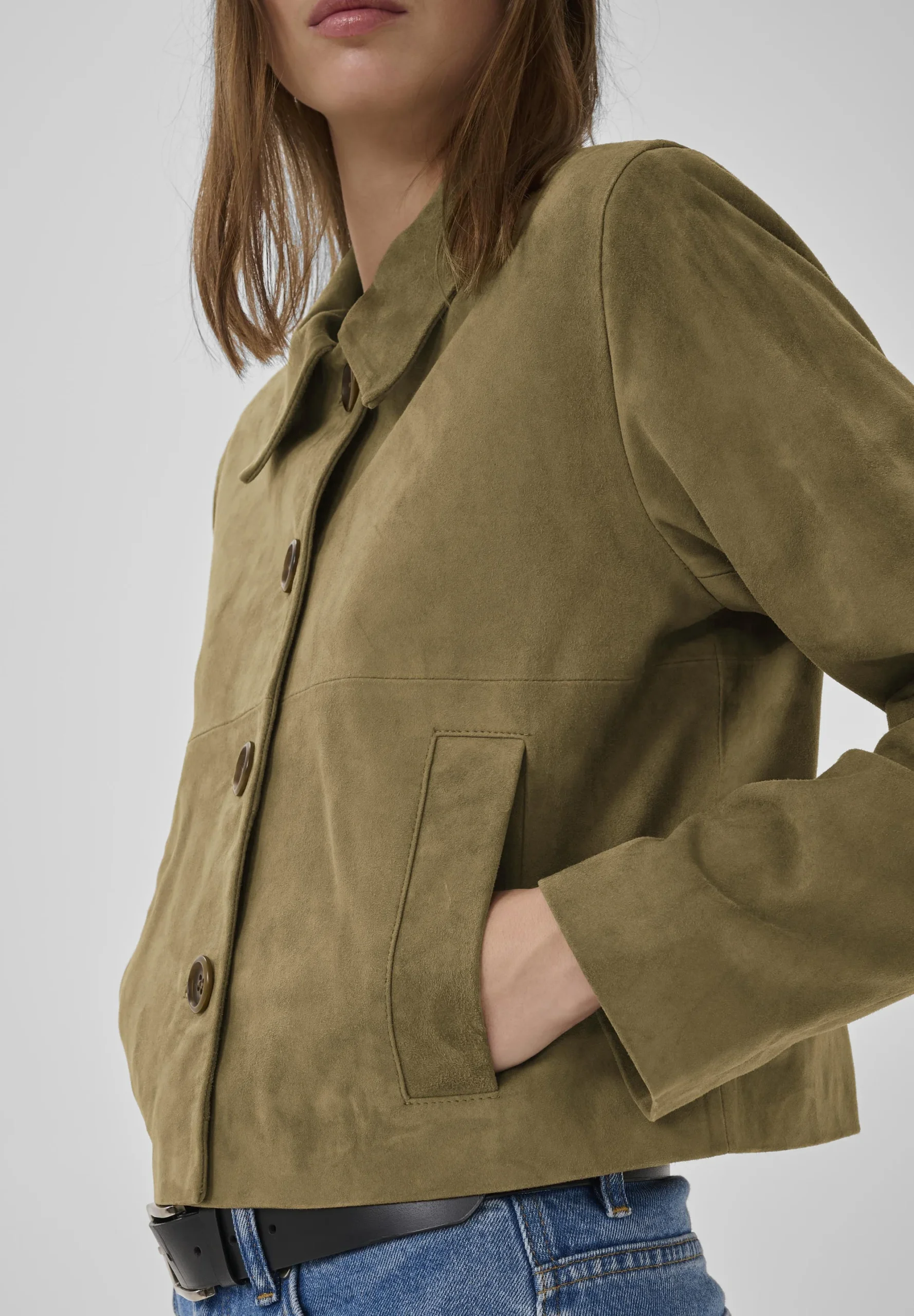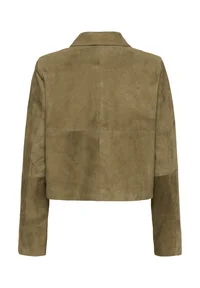 Dit cropped damesjack van suède heeft een ontspannen pasvorm, klassieke kraag en knoopsluiting. Gemakkelijk te combineren voor een moderne, comfortabele look.