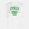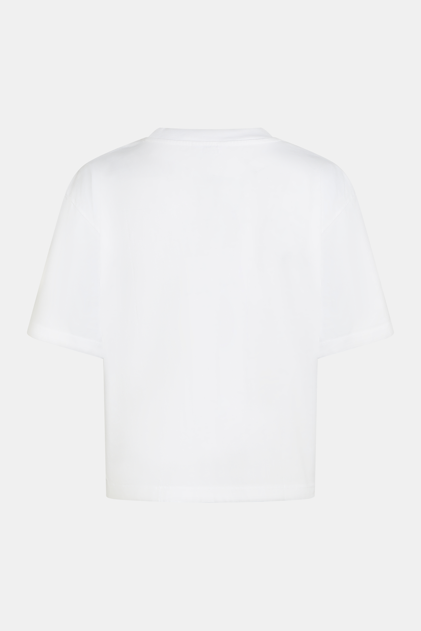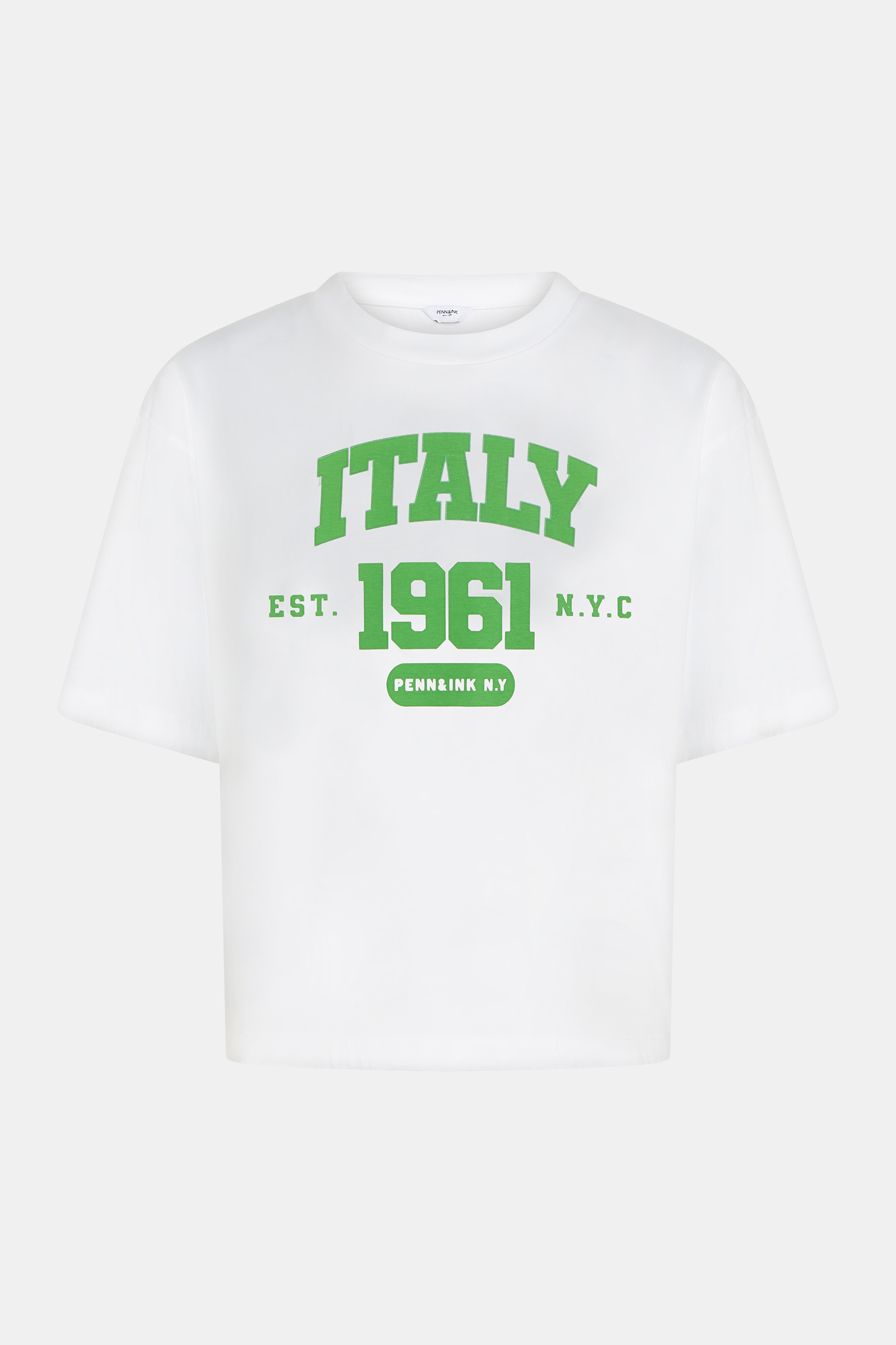 Wit t-shirt met korte mouw en roze hals en groene opdruk