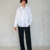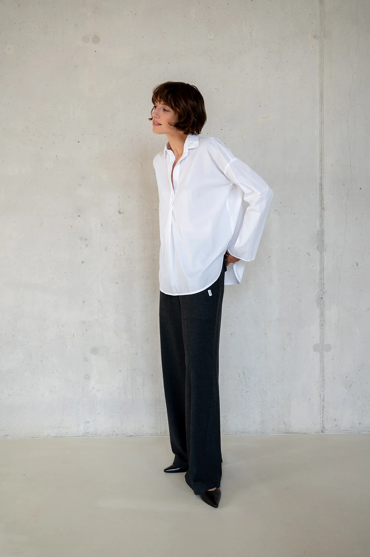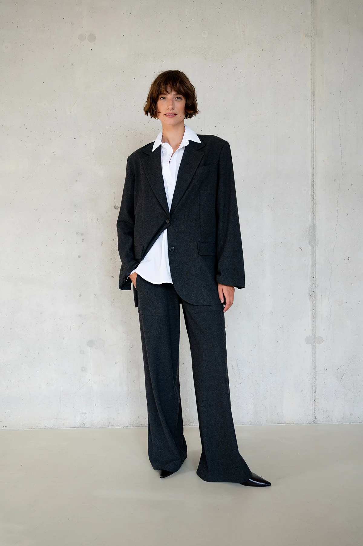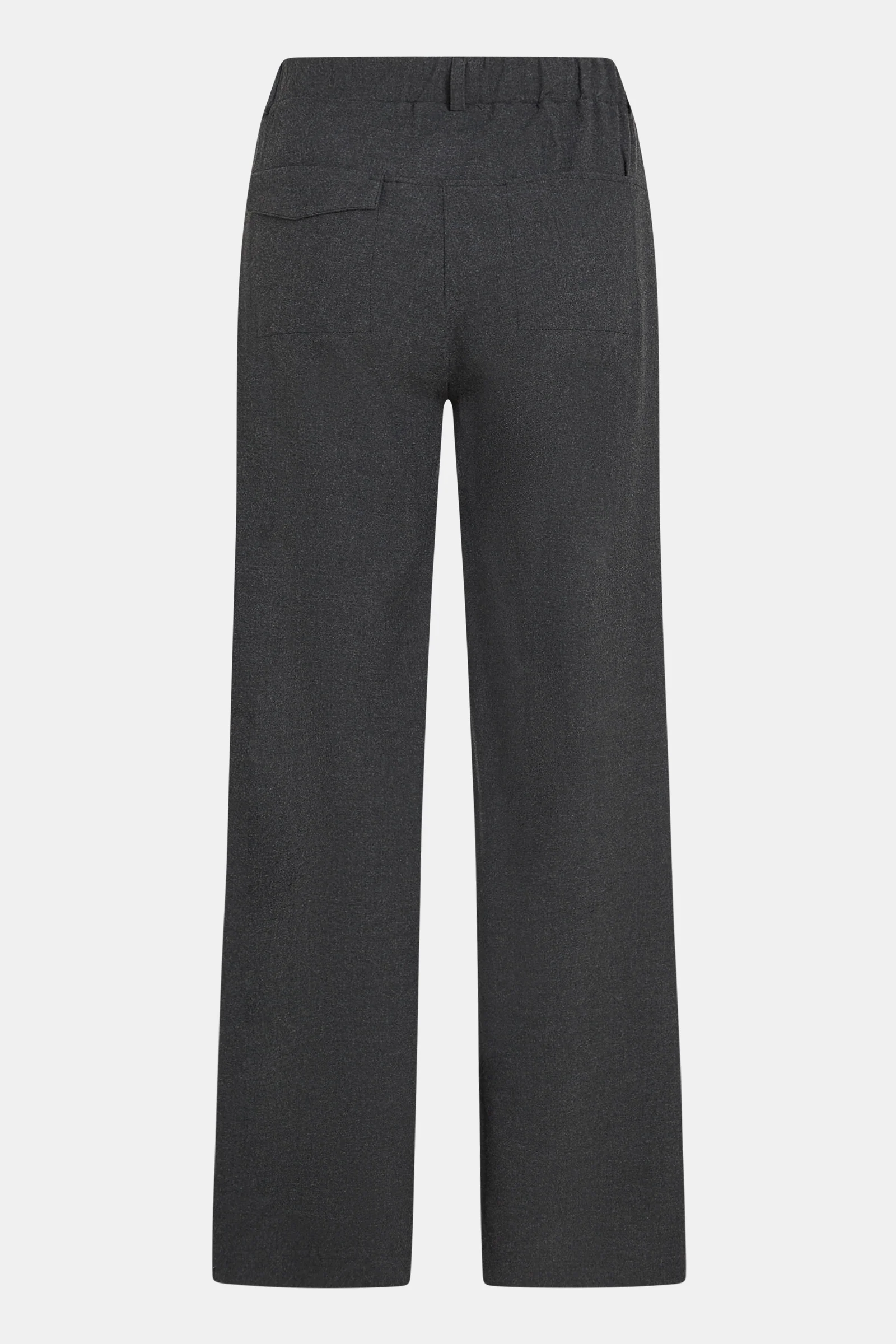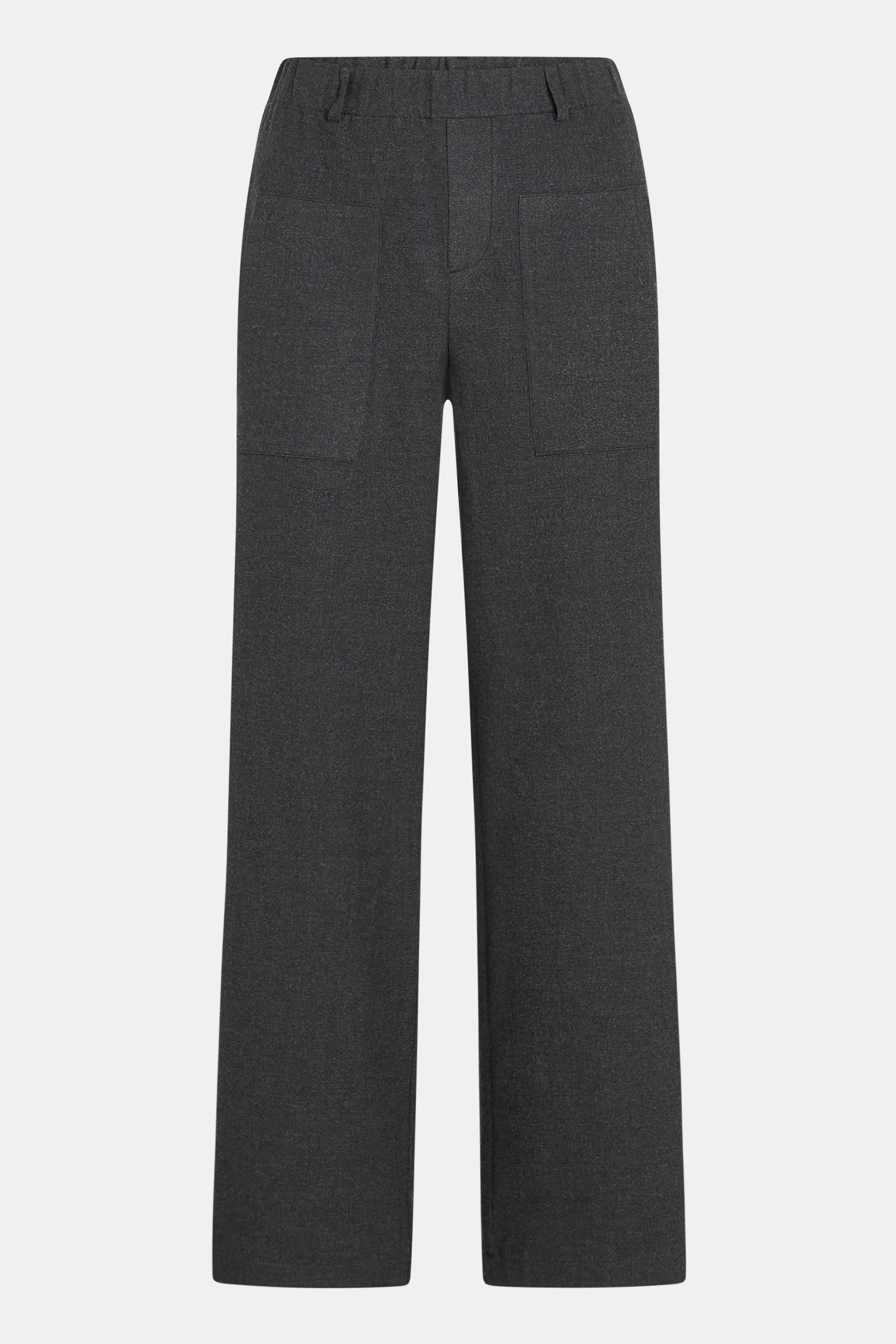 These trousers feature large front pockets, an elasticated waistline, and a high waist for a comfortable yet structured fit. Designed with a wide, straight leg and back pockets, they blend practicality with a modern silhouette.