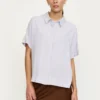 Crafted with short sleeves, a classic shirt collar, a hidden button closure, and wide shoulders.