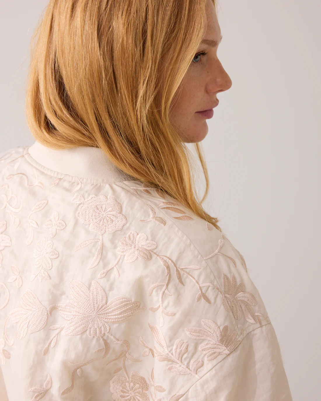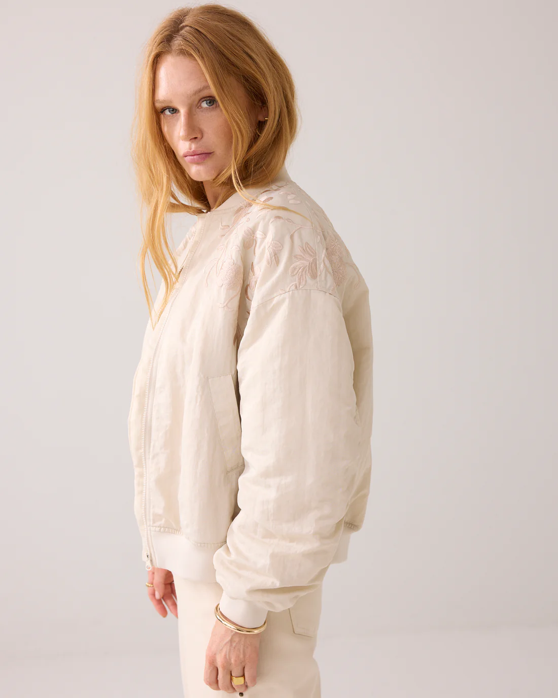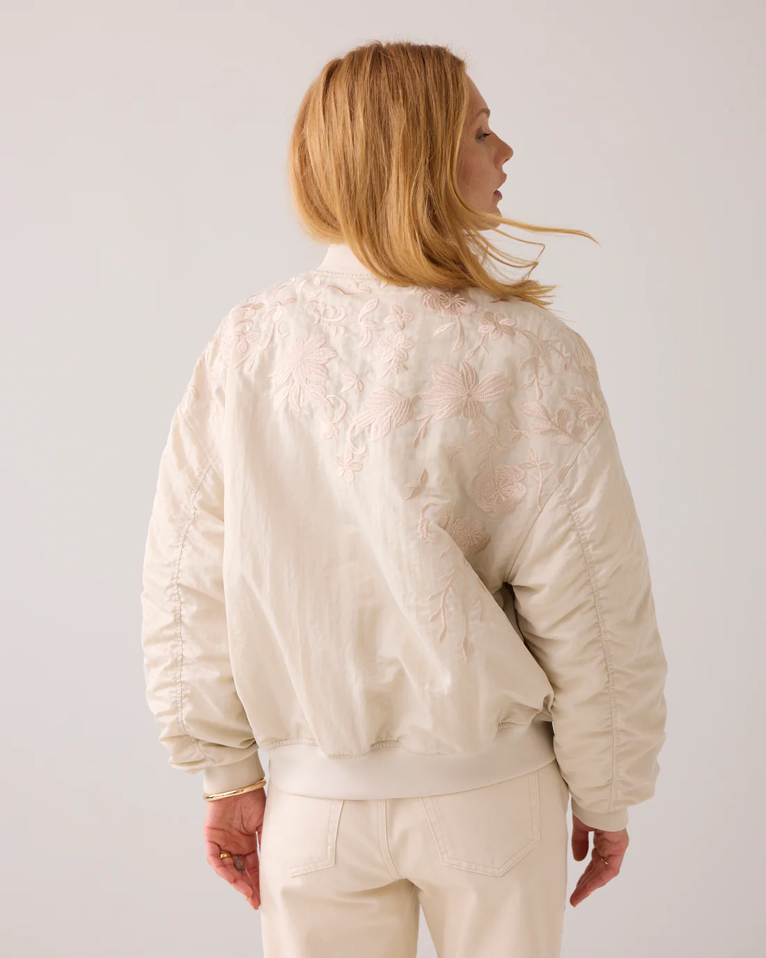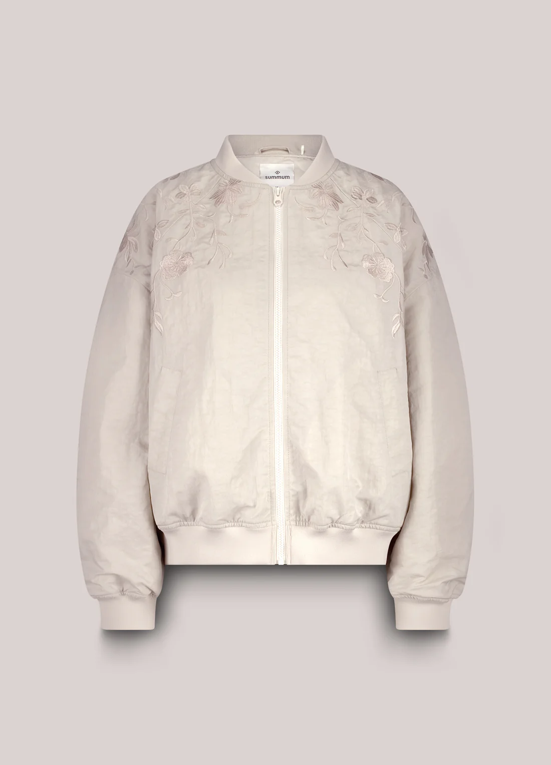 Deze licht glanzende bomber is gevoerd en gewatteerd, en gemaakt van een stevige stof. Het jack is rijk gedetailleerd met ton-sur-ton borduursels op de schouders, zowel voor als achter. De geplooide naden op de achterkant van de mouwen versterken de typische bomberlook.