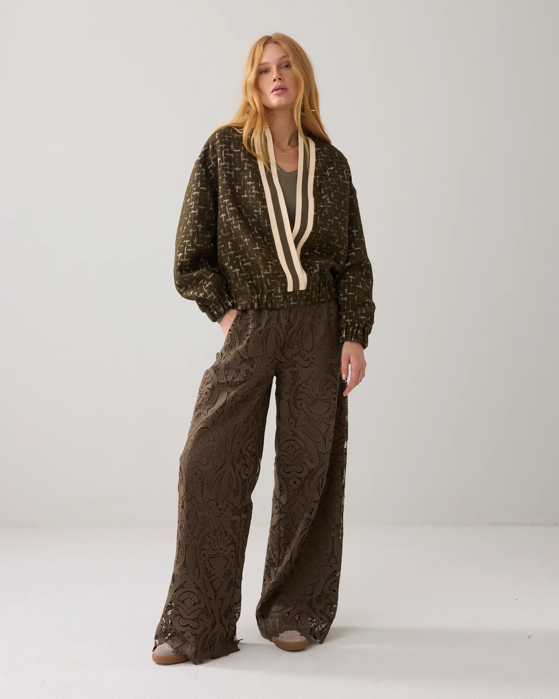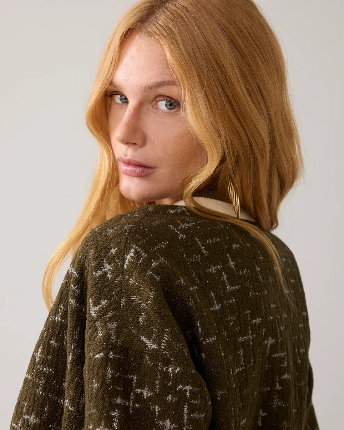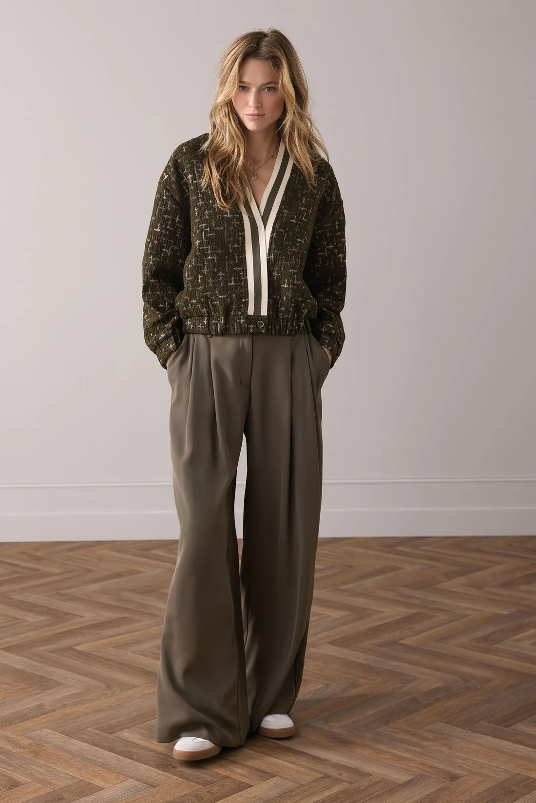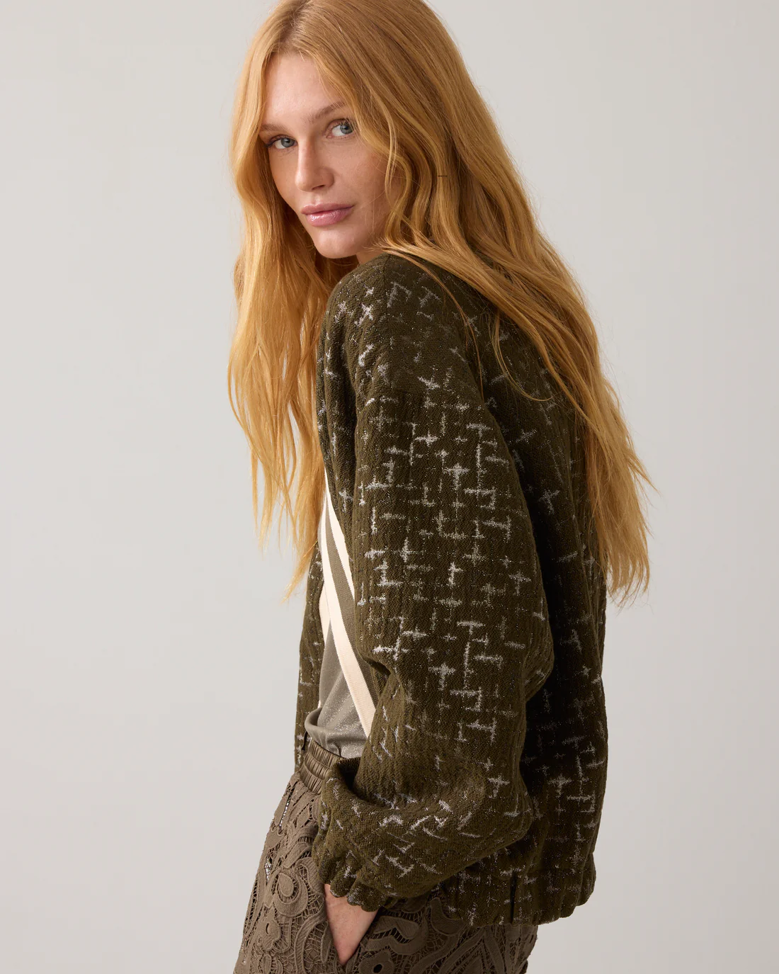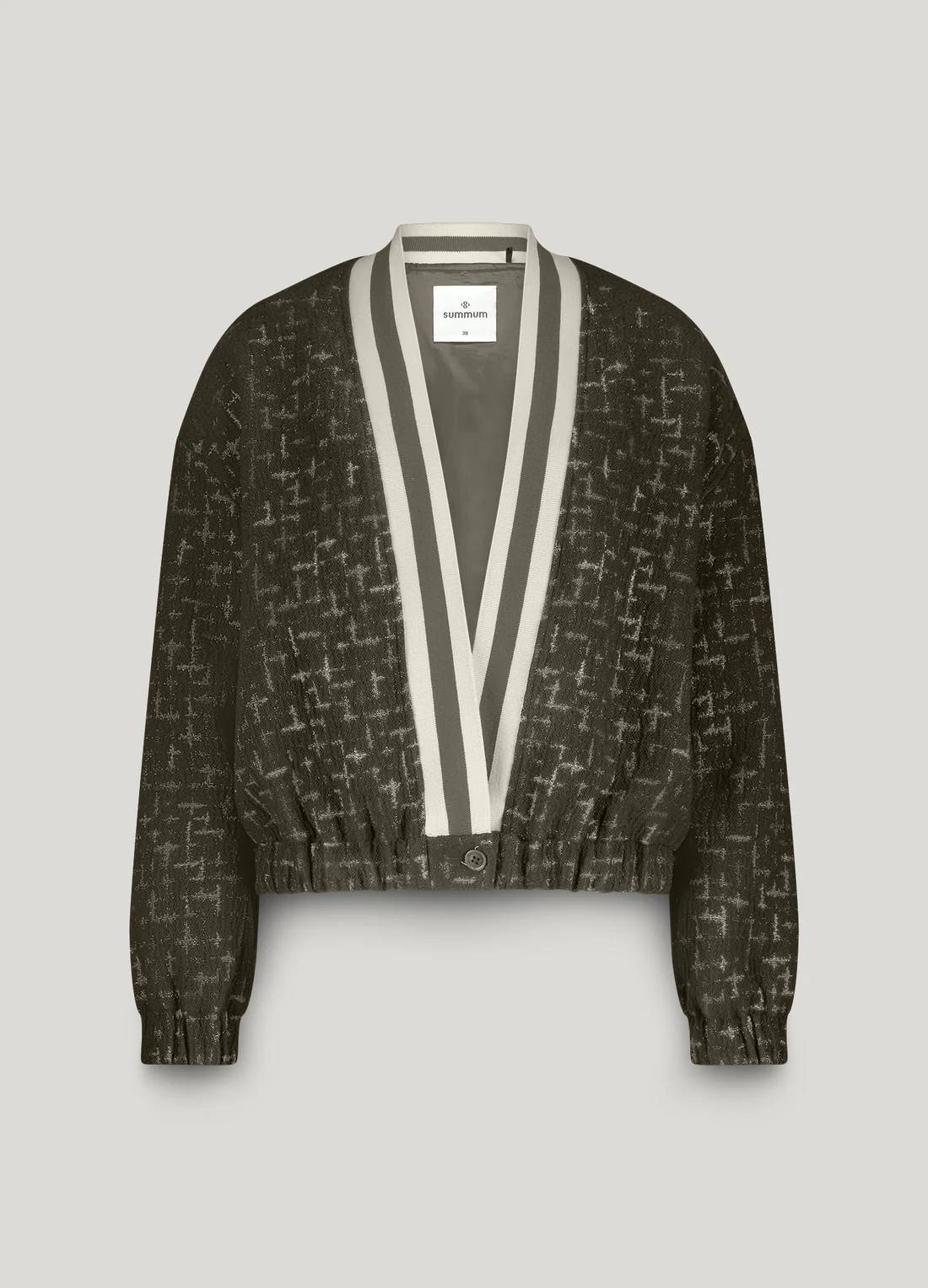Sportief bombervest met een fancy jacquard voorpand en mouwen. Het vest heeft een elastische boord en is te sluiten met één knoop.
