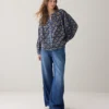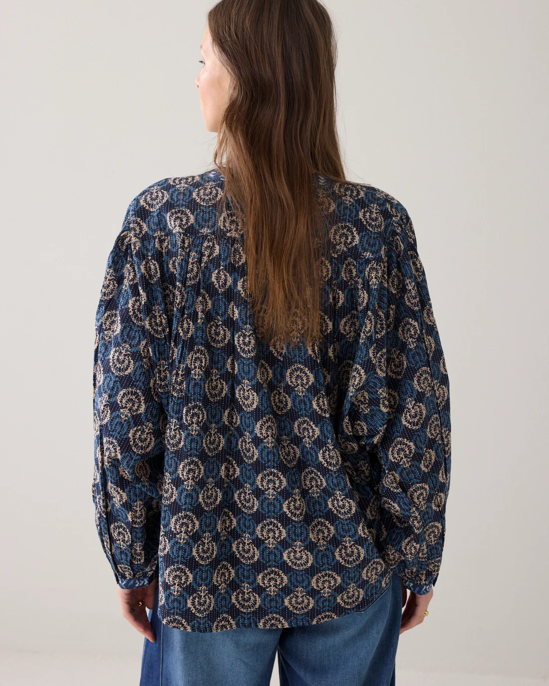 Ruimvallende blouse met grote vleermuismouw. De blouse heeft een ronde onderkant en doorknoopsluiting en is gemaakt van een luchtige blockprint-stof met een contrasterende bies.Â