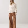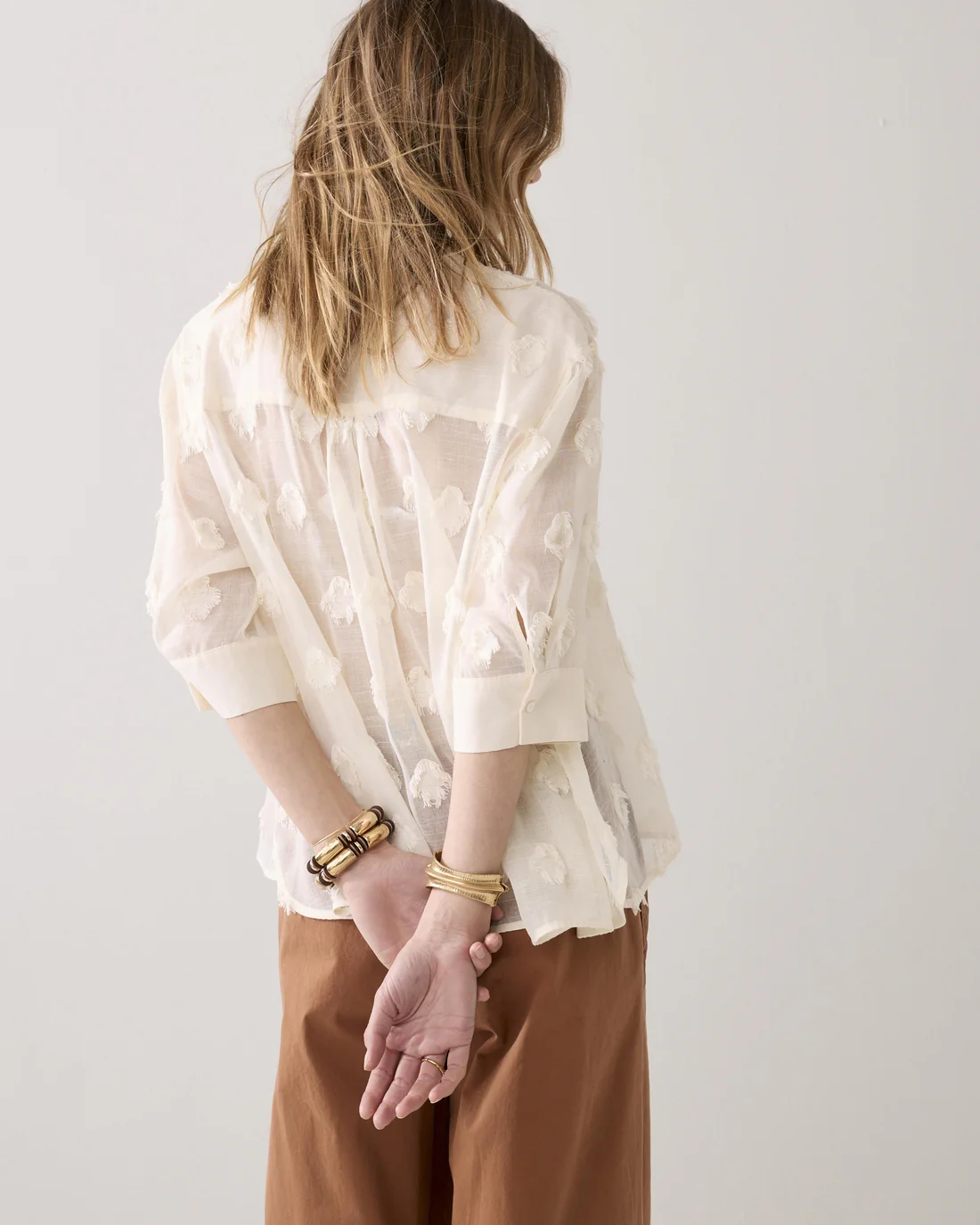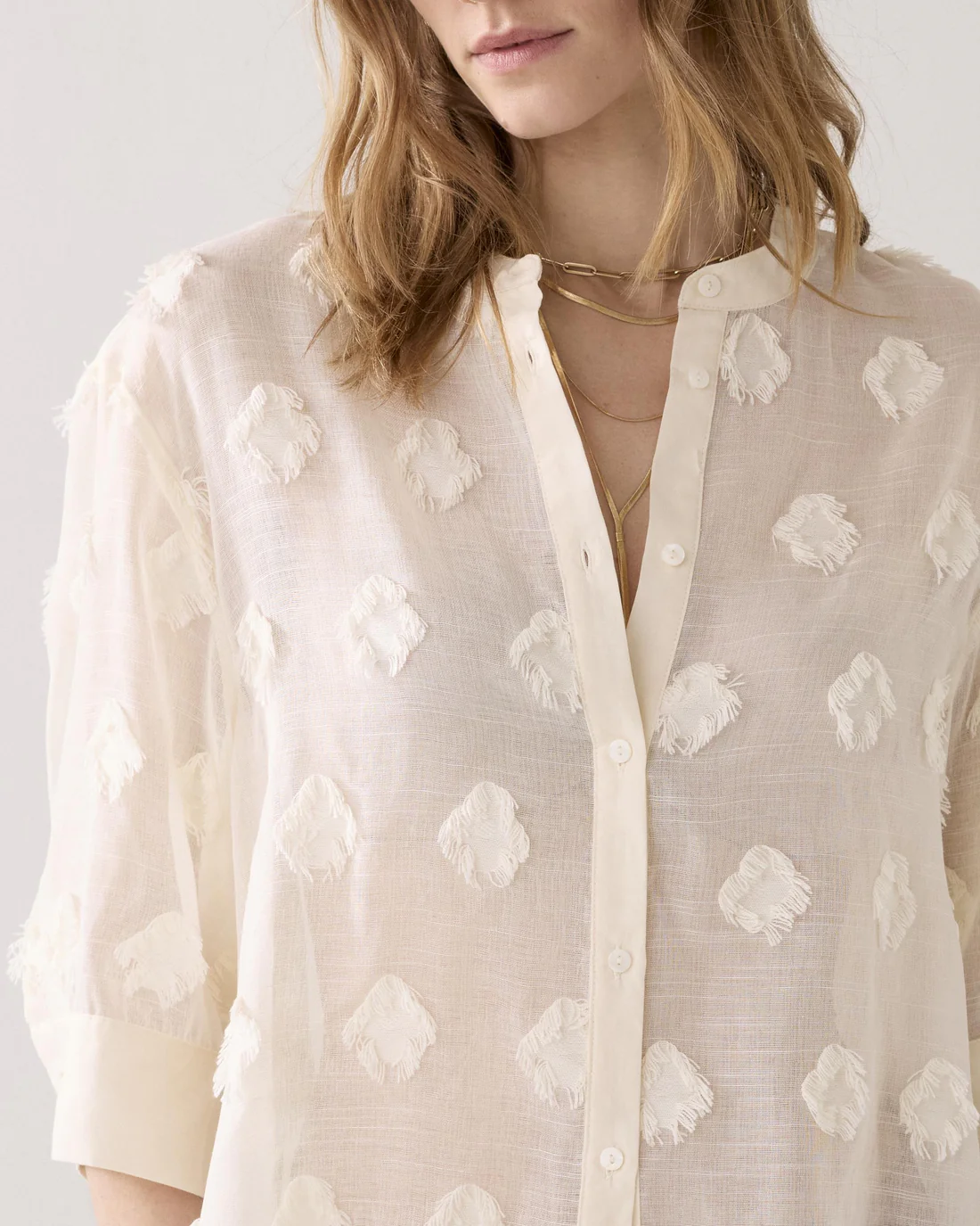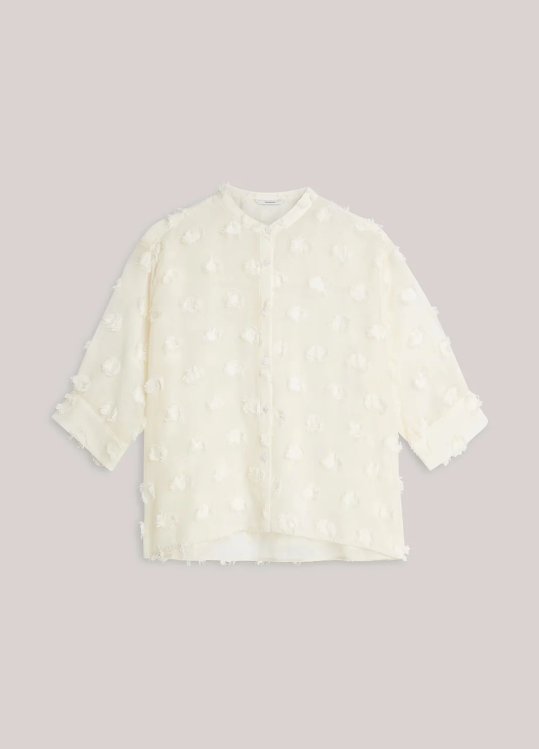 A-lijn blouse in een transparante kwaliteit met 3D-dots. De blouse heeft korte ballonmouwen tot over de elleboog met een stoffen manchet, een boordje met schelpknoopjes en rimpeling op de achterpas.