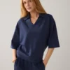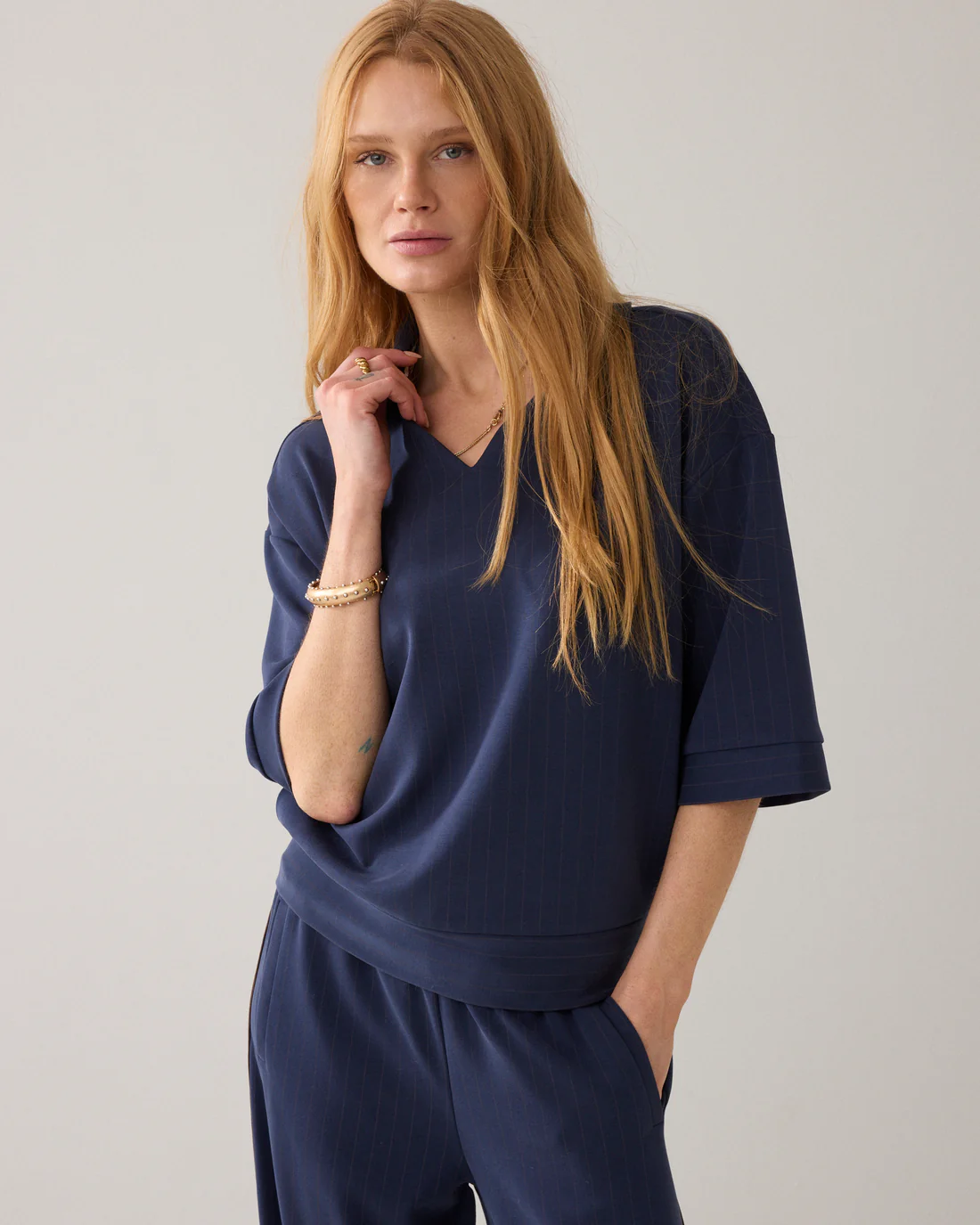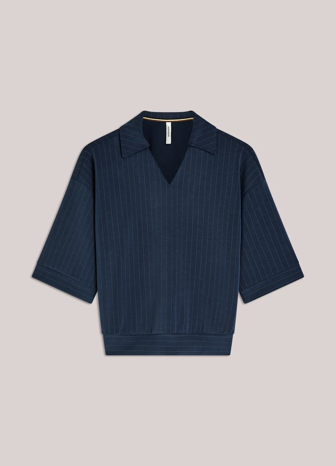 Top van pinstripe soft scuba in een soepele kwaliteit: onze bestseller-stof uit de herfstcollectie. De polo heeft een boxy fit met aangesloten onderkant op de heupen, een polokraag met klein splitje en halflange mouwen met off-shoulder pasvorm.