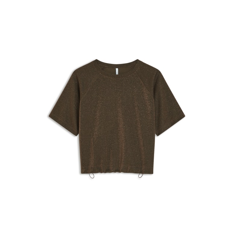 korte boxy top in bruine glitterstof met koord aan de onderzijde