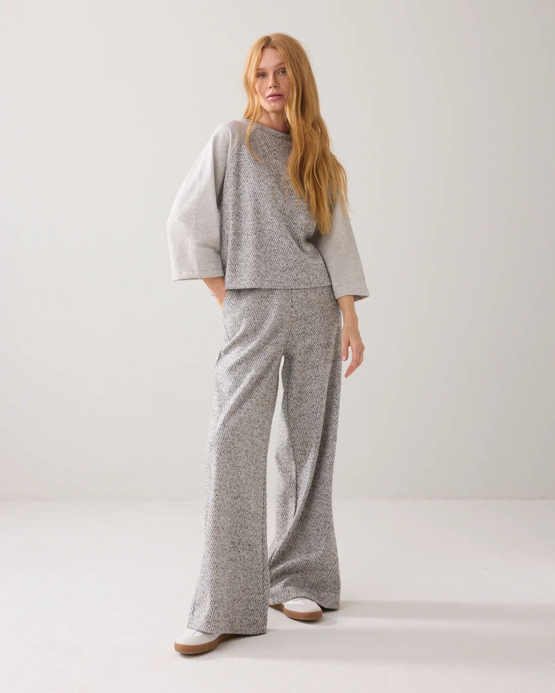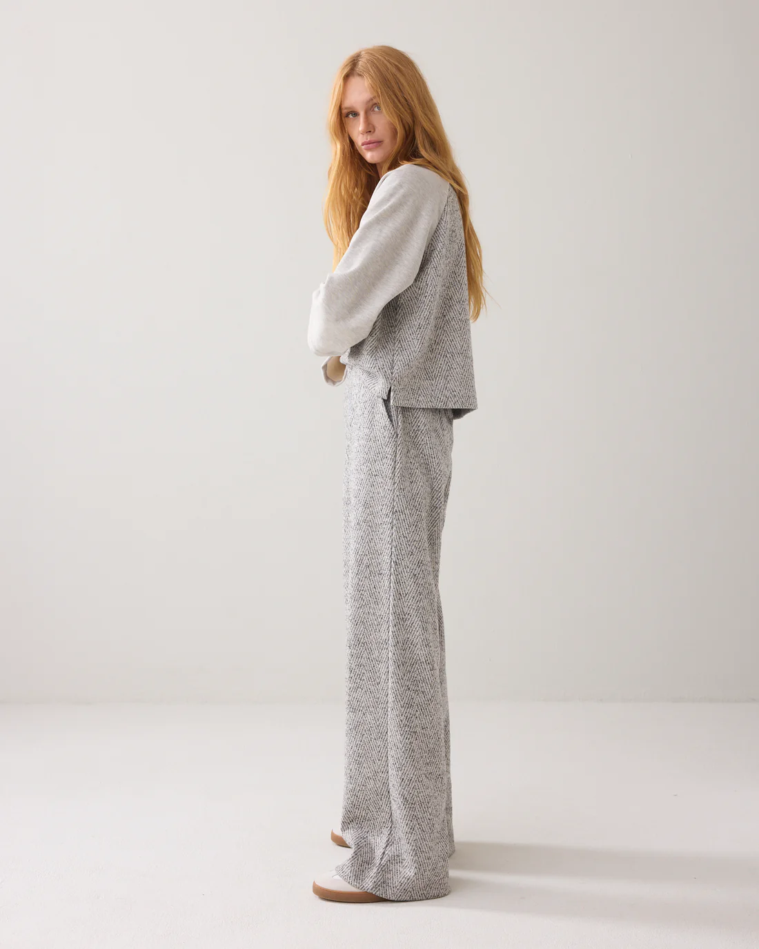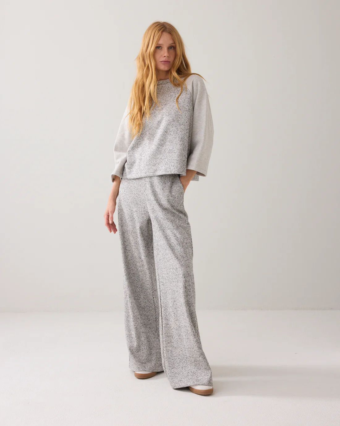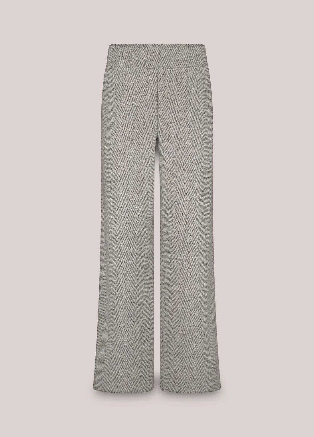Deze broek heeft een super feminine fit en is uitgevoerd in een rijke visgraatjacquard. De luxe stof valt mooi soepel, zacht en comfortabel. De broek heeft een hoge elastische tailleband en extreem wijde pijpen.