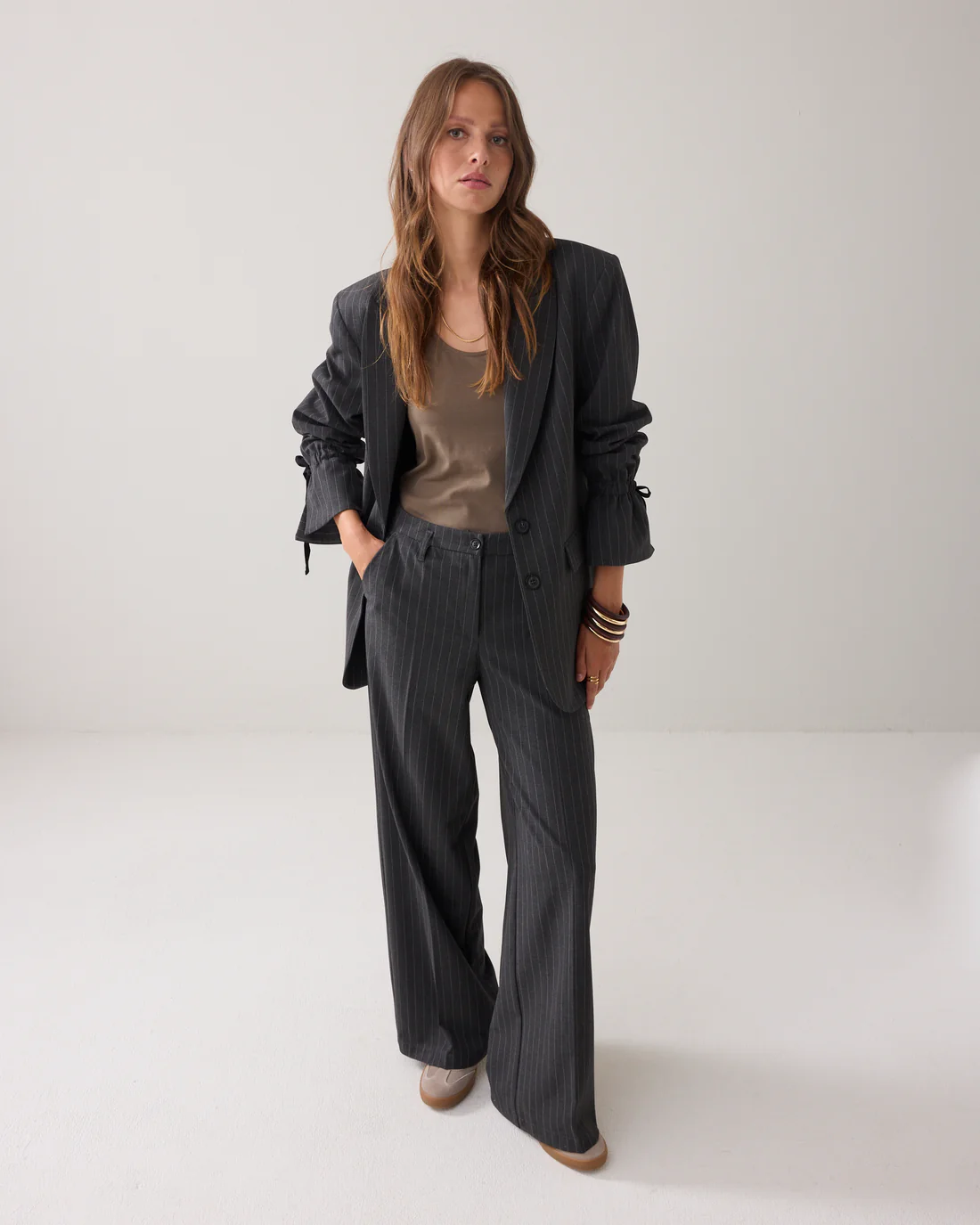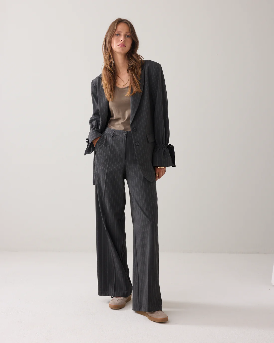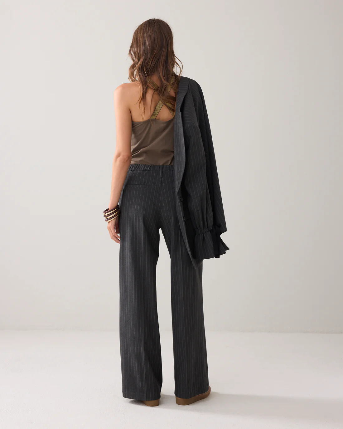 Deze krijtstreep broek heeft een hoge taille, elastiek in de tailleband en steekzakken. De broek heeft rechte pijpen met een persvouw.