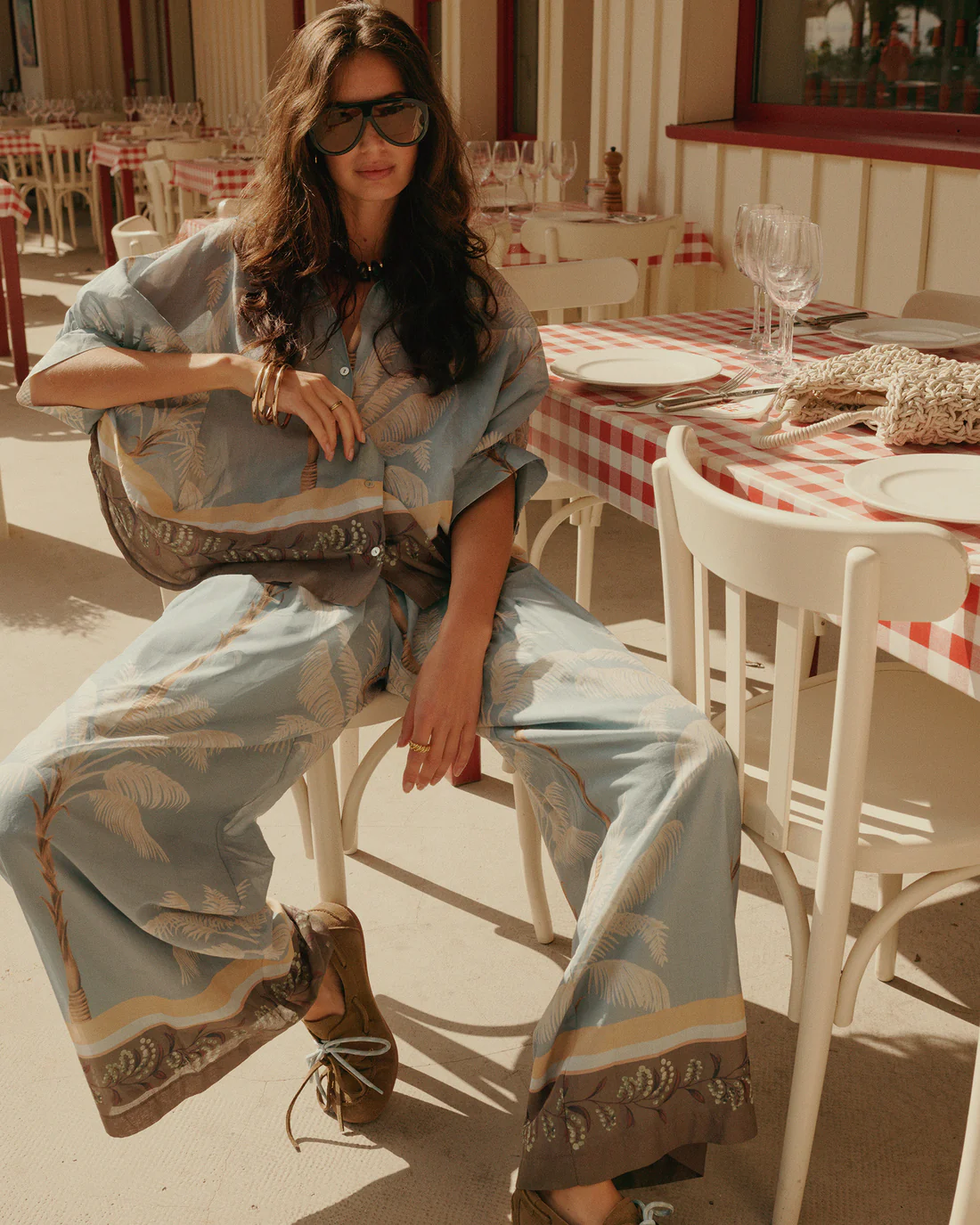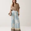 Broek in een lichte kwaliteit met een zomerse strandprint en een wijde pijp tot op de grond. De broek is volledig gevoerd met zachte viscose. Leuk te combineren met de Bijpassende top 2s3496.