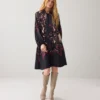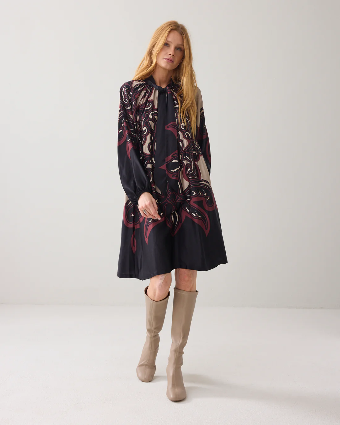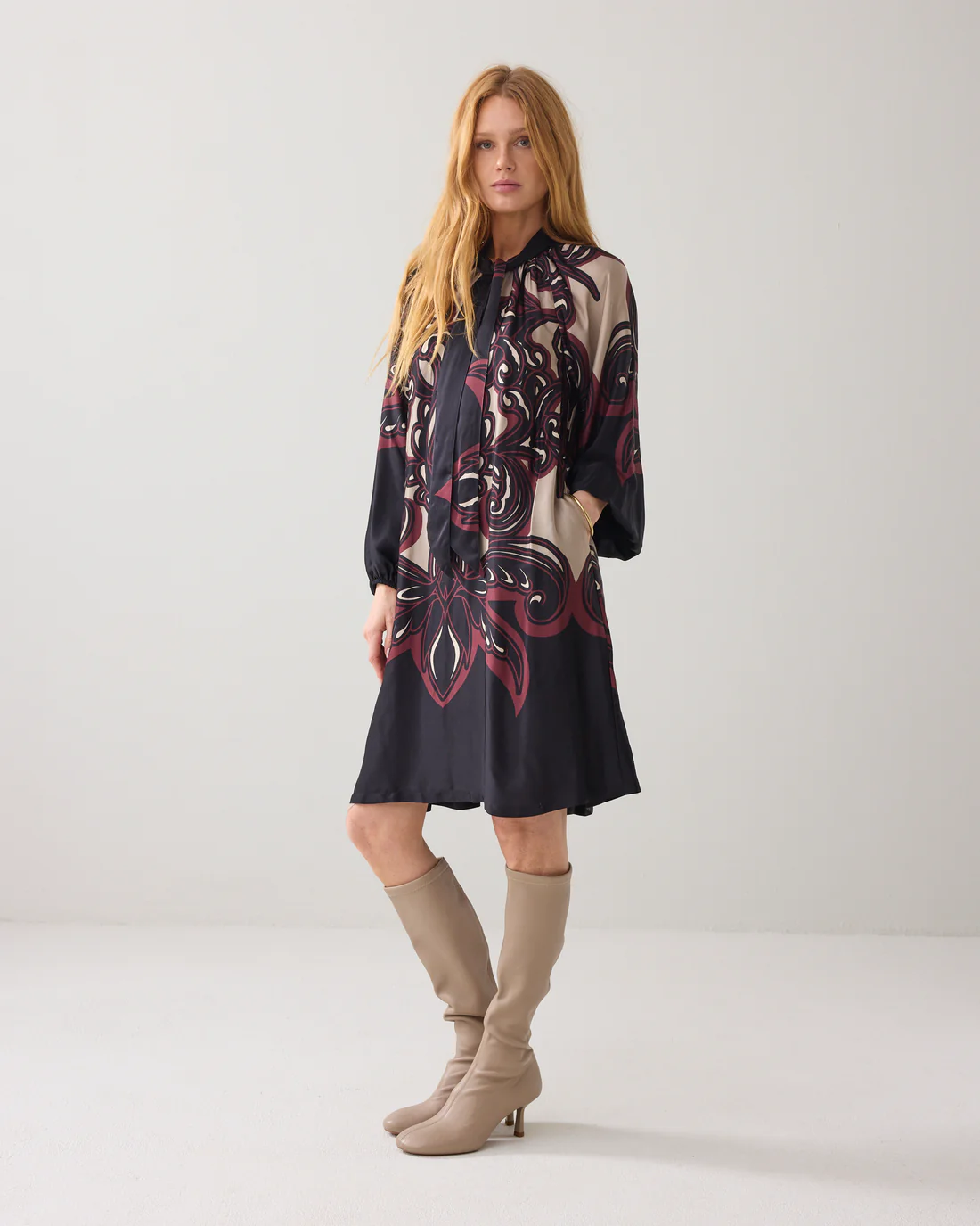 Jurk van satijnviscose met een unieke ornamentprint. Het model heeft een A-lijn, raglanmouwen met elastiek in de manchetten en zakken in de zijnaad. Afgewerkt met een split en striksluiting in de hals. De jurk valt op de knie.
