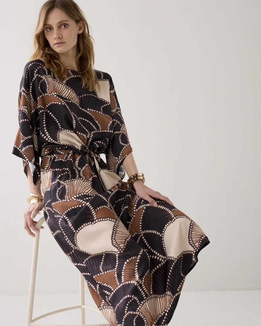 Jurk van soepele satijntwill met een lichte glans. De jurk heeft een boothals met afgebiesde rand, wijde rechte mouwen met verlaagde schoudernaad en een aangerimpelde taille met een tunnelkoordje.