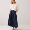 Stoere rok van taft met een tailleband aan de voorkant en elastiek achter voor extra comfort. De rok is uitgevoerd met steekzakken en platte plooien, en valt wijd uit.