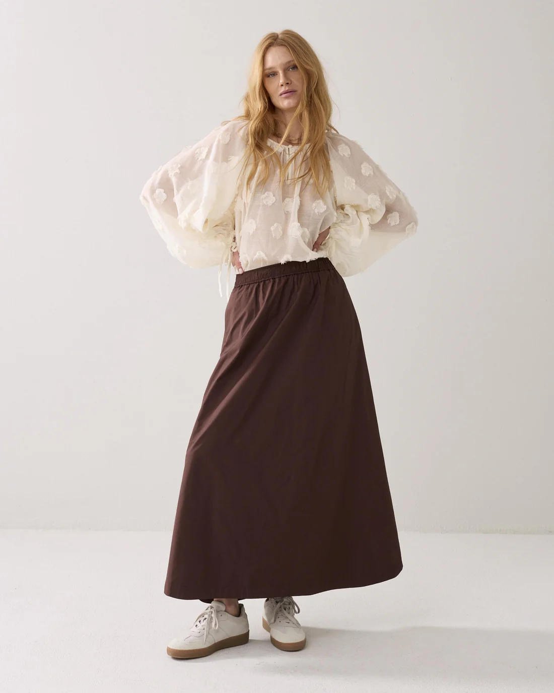 Rok in een stoere taftkwaliteit. De rok heeft een wijde vorm en rondom een elastische taille.