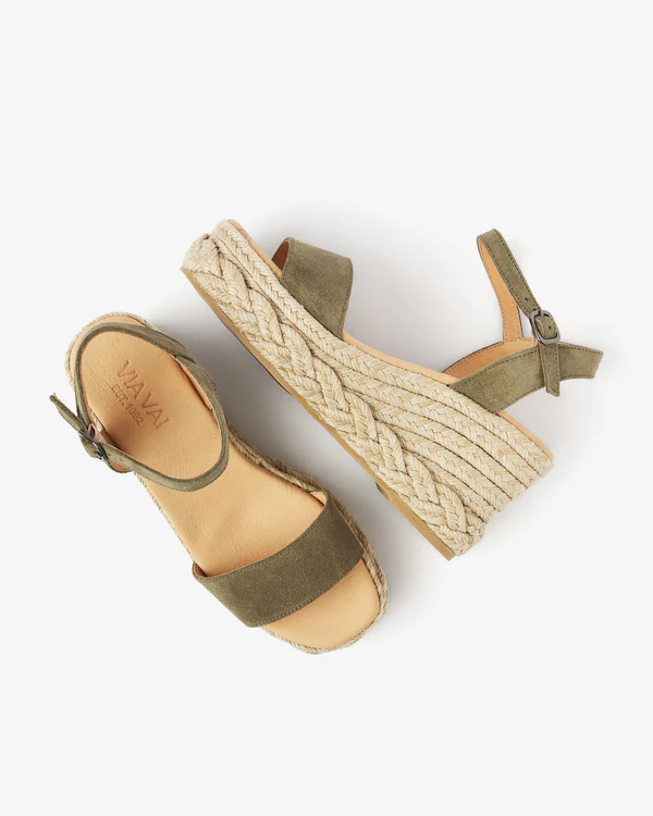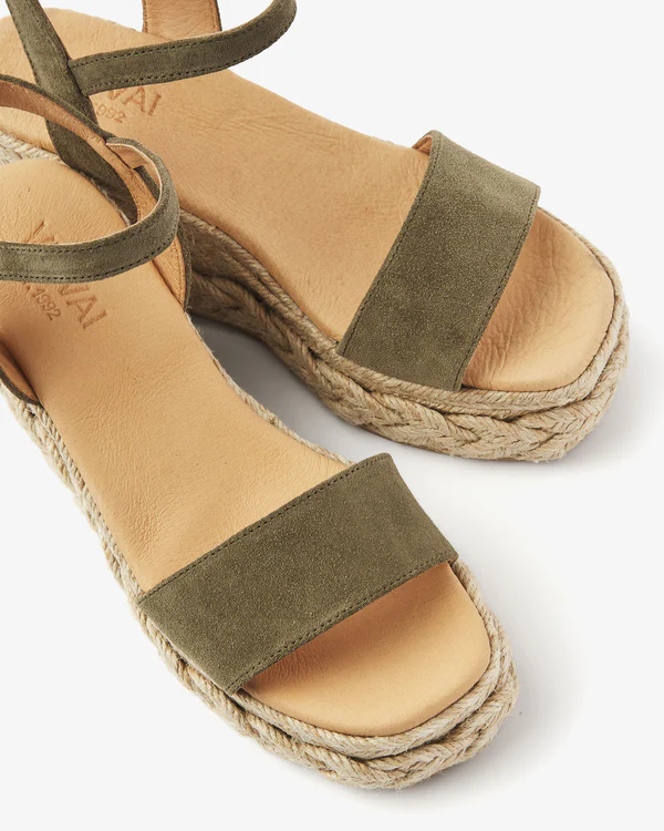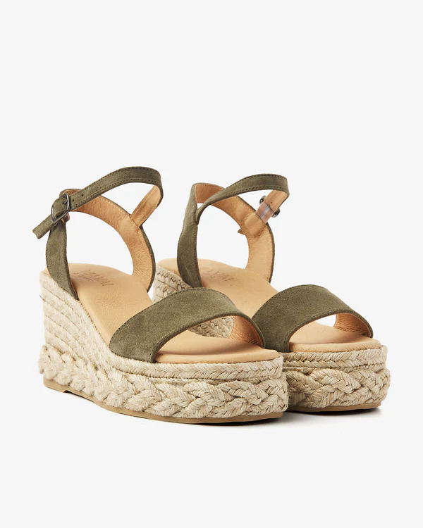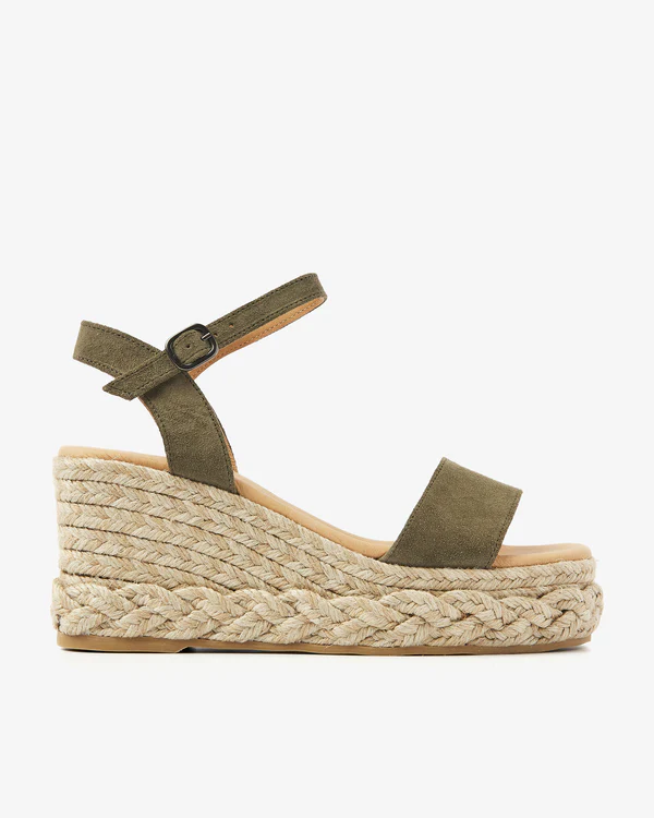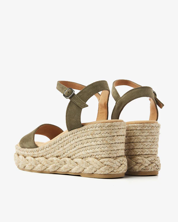 Summer vibes gegarandeerd. Deze suède espadrille met elegante sleehak is de perfecte mix van comfort en stijl. Het verstelbare enkelbandje zorgt voor de perfecte fit, terwijl het bandje over de voorvoet je voet mooi omsluit. Het gevlochten detail op de zool maakt de Capri Neva sandalen af. Een echte must-have voor elke schoenliefhebber. Ready to elevate your look?